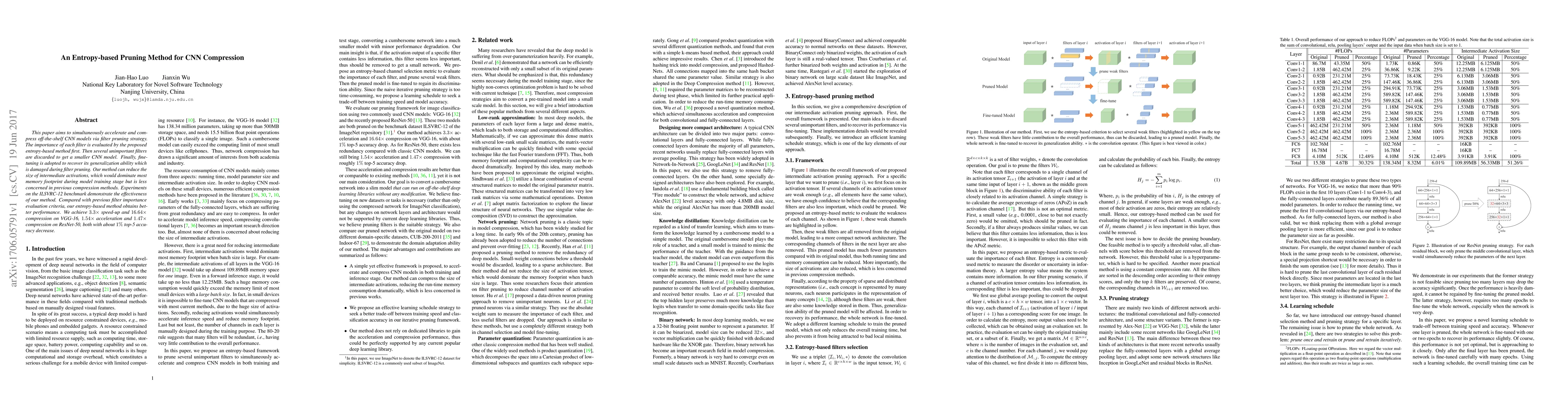 This paper proposes an entropy-based pruning method to compress and accelerate CNN models by discarding unimportant filters, followed by fine-tuning to maintain accuracy. Experiments show significant speed-up and compression with minimal loss in performance on ILSVRC-12.