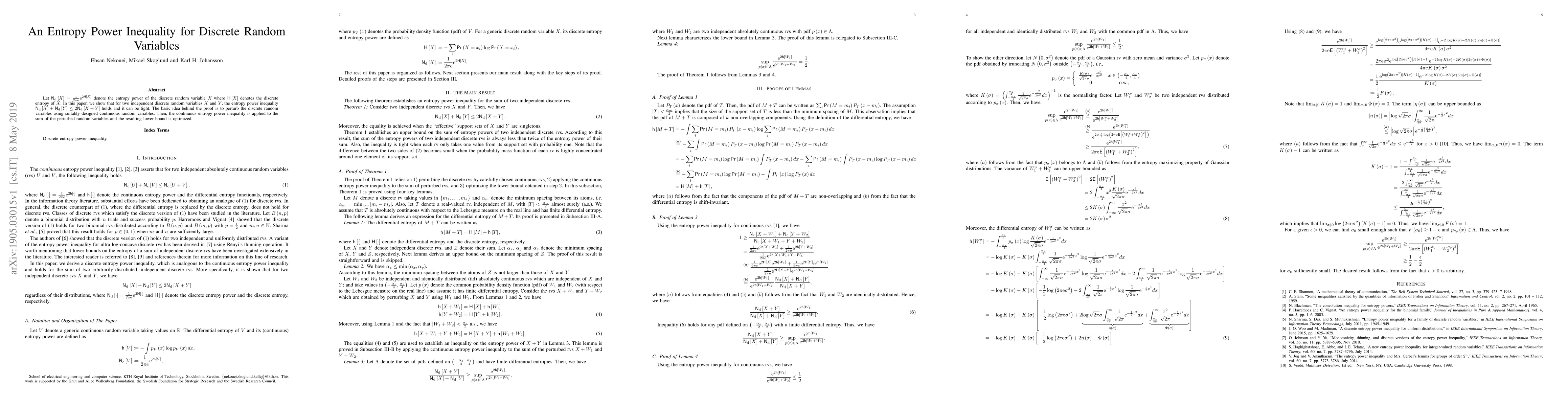 This paper establishes an entropy power inequality for independent discrete random variables, showing that $\mathsf{N}_{\rm d}\left[X\right]+\mathsf{N}_{\rm d}\left[Y\right]\leq 2 \mathsf{N}_{\rm d}\left[X+Y\right]$ holds and can be tight, using a method that involves perturbing discrete variables with continuous ones and optimizing the continuous entropy power inequality.