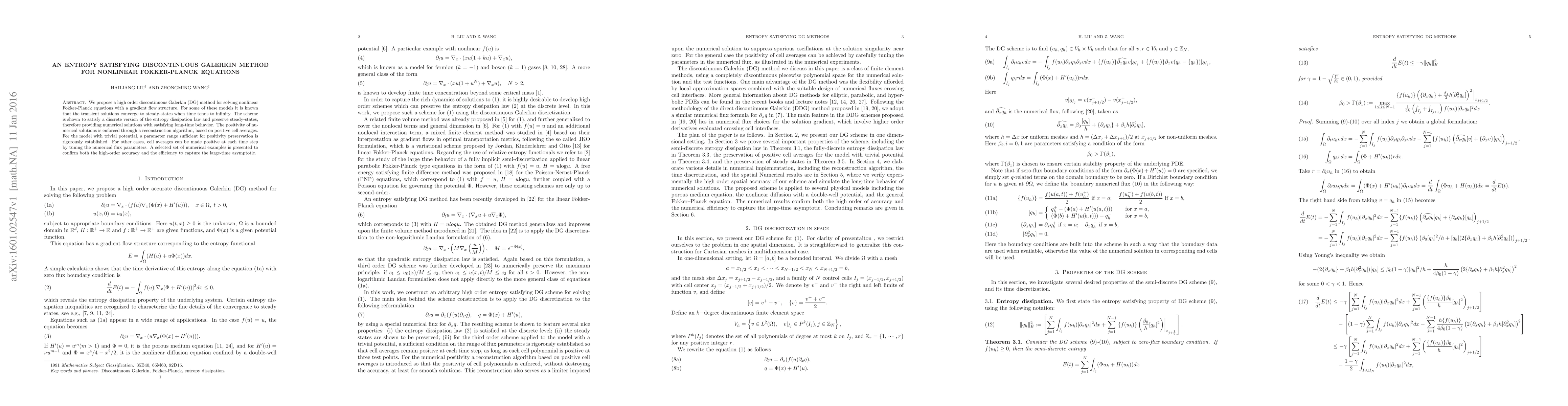 This paper proposes a high-order discontinuous Galerkin method for solving nonlinear Fokker-Planck equations, ensuring entropy satisfaction and steady-state preservation. The method enforces positivity through a reconstruction algorithm, with a rigorous proof for trivial potential cases and parameter tuning for others.