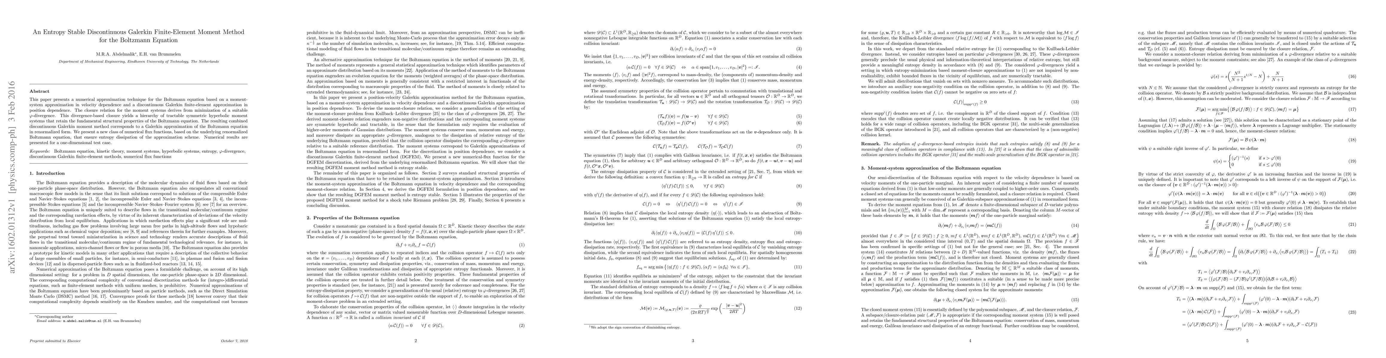 This paper introduces a novel entropy stable discontinuous Galerkin finite-element moment method for solving the Boltzmann equation, combining moment system approximations with a divergence-based closure relation to maintain structural properties. The method ensures entropy dissipation through new numerical flux functions, demonstrated via a one-dimensional test case.