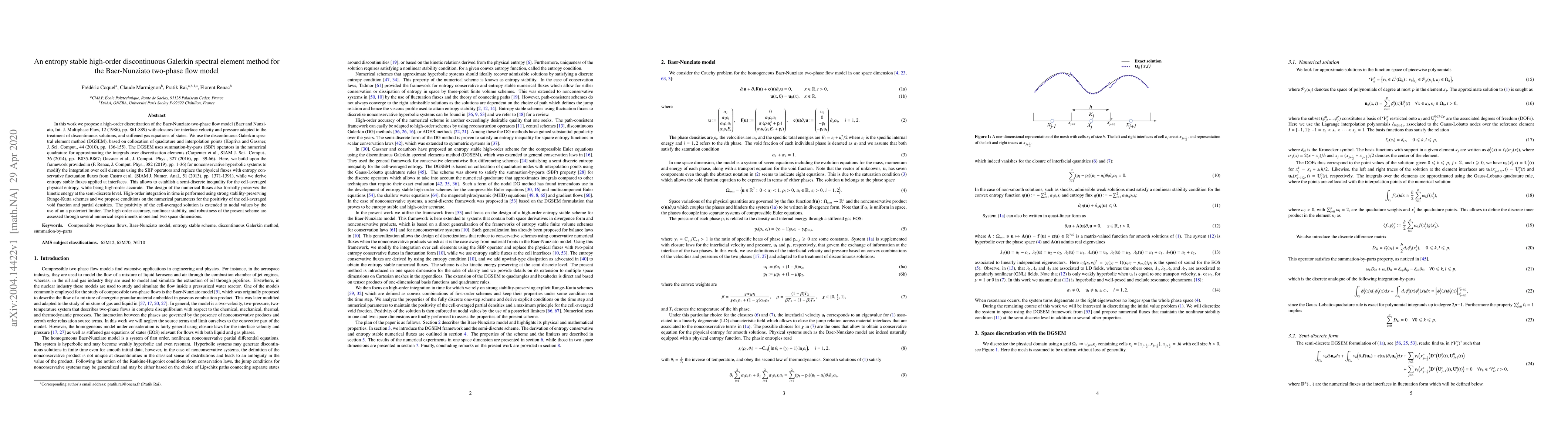 In this work we propose a high-order discretization of the Baer-Nunziato two-phase flow model (Baer and Nunziato, Int. J. Multiphase Flow, 12 (1986), pp. 861-889) with closures for interface velocity and pressure adapted to the treatment of discontinuous solutions, and stiffened gas equations of states. We use the discontinuous Galerkin spectral element method (DGSEM), based on collocation of quadrature and interpolation points (Kopriva and Gassner, J. Sci. Comput., 44 (2010), pp. 136-155). The DGSEM uses summation-by-parts (SBP) operators in the numerical quadrature for approximating the integrals over discretization elements (Carpenter et al., SIAM J. Sci. Comput., 36 (2014), pp. B835-B867; Gassner et al., J. Comput. Phys., 327 (2016), pp. 39-66). Here, we build upon the framework provided in (F. Renac, J. Comput. Phys., 382 (2019), pp. 1-36) for nonconservative hyperbolic systems to modify the integration over cell elements using the SBP operators and replace the physical fluxes with entropy conservative fluctuation fluxes from Castro et al. (SIAM J. Numer. Anal., 51 (2013), pp. 1371-1391), while we derive entropy stable fluxes applied at interfaces. This allows to establish a semi-discrete inequality for the cell-averaged physical entropy, while being high-order accurate. The design of the numerical fluxes also formally preserves the kinetic energy at the semi-discrete level. High-order integration in time is performed using strong stability-preserving Runge-Kutta schemes and we propose conditions on the numerical parameters for the positivity of the cell-averaged void fraction and partial densities. The positivity of the cell-averaged solution is extended to nodal values by the use of an a posteriori limiter. The high-order accuracy, nonlinear stability, and robustness of the present scheme are assessed through several numerical experiments in one and two space dimensions.
