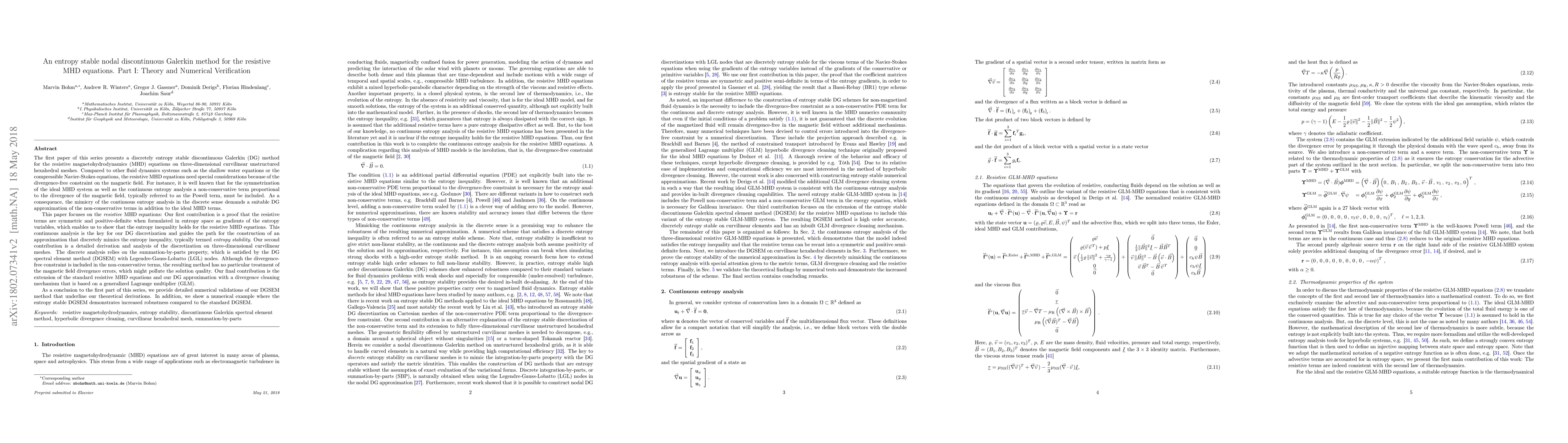 The first paper of this series presents a discretely entropy stable discontinuous Galerkin (DG) method for the resistive magnetohydrodynamics (MHD) equations on three-dimensional curvilinear unstructured hexahedral meshes. Compared to other fluid dynamics systems such as the shallow water equations or the compressible Navier-Stokes equations, the resistive MHD equations need special considerations because of the divergence-free constraint on the magnetic field. For instance, it is well known that for the symmetrization of the ideal MHD system as well as the continuous entropy analysis a non-conservative term proportional to the divergence of the magnetic field, typically referred to as the Powell term, must be included. As a consequence, the mimicry of the continuous entropy analysis in the discrete sense demands a suitable DG approximation of the non-conservative terms in addition to the ideal MHD terms. This paper focuses on the resistive MHD equations: Our first contribution is a proof that the resistive terms are symmetric and positive-definite when formulated in entropy space as gradients of the entropy variables. This enables us to show that the entropy inequality holds for the resistive MHD equations. This continuous analysis is the key for our DG discretization and guides the path for the construction of an approximation that discretely mimics the entropy inequality, typically termed entropy stability. Our second contribution is a detailed derivation and analysis of the discretization on three-dimensional curvilinear meshes. The discrete analysis relies on the summation-by-parts property, which is satisfied by the DG spectral element method (DGSEM) with Legendre-Gauss-Lobatto (LGL) nodes. Although the divergence-free constraint is included in the non-conservative terms, the resulting method has no particular treatment of the magnetic field divergence errors...