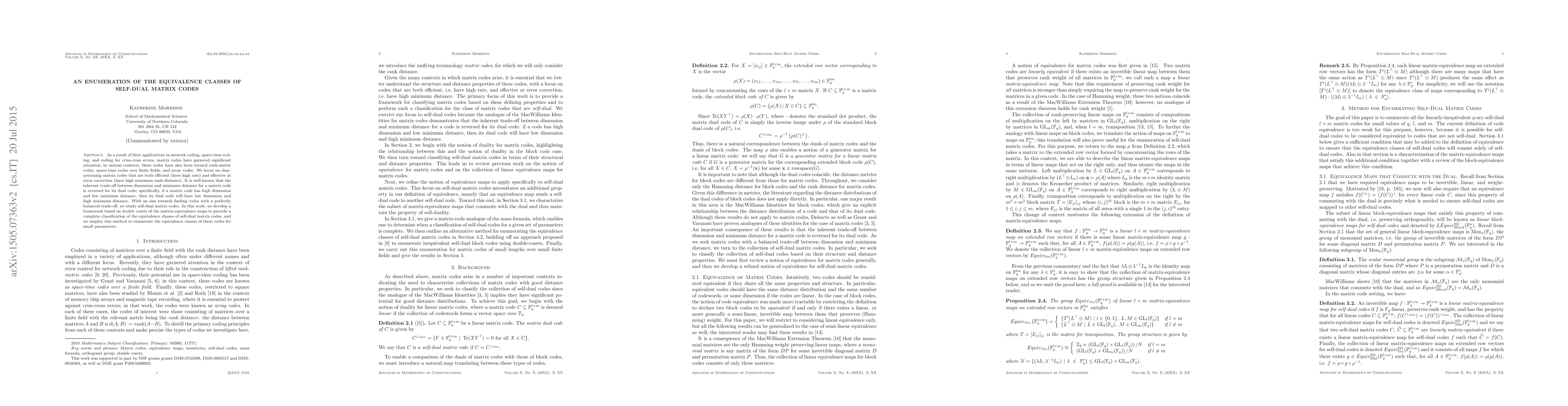 As a result of their applications in network coding, space-time coding, and coding for criss-cross errors, matrix codes have garnered significant attention; in various contexts, these codes have also been termed rank-metric codes, space-time codes over finite fields, and array codes. We focus on characterizing matrix codes that are both efficient (have high rate) and effective at error correction (have high minimum rank-distance). It is well known that the inherent trade-off between dimension and minimum distance for a matrix code is reversed for its dual code; specifically, if a matrix code has high dimension and low minimum distance, then its dual code will have low dimension and high minimum distance. With an aim towards finding codes with a perfectly balanced trade-off, we study self-dual matrix codes. In this work, we develop a framework based on double cosets of the matrix-equivalence maps to provide a complete classification of the equivalence classes of self-dual matrix codes, and we employ this method to enumerate the equivalence classes of these codes for small parameters.