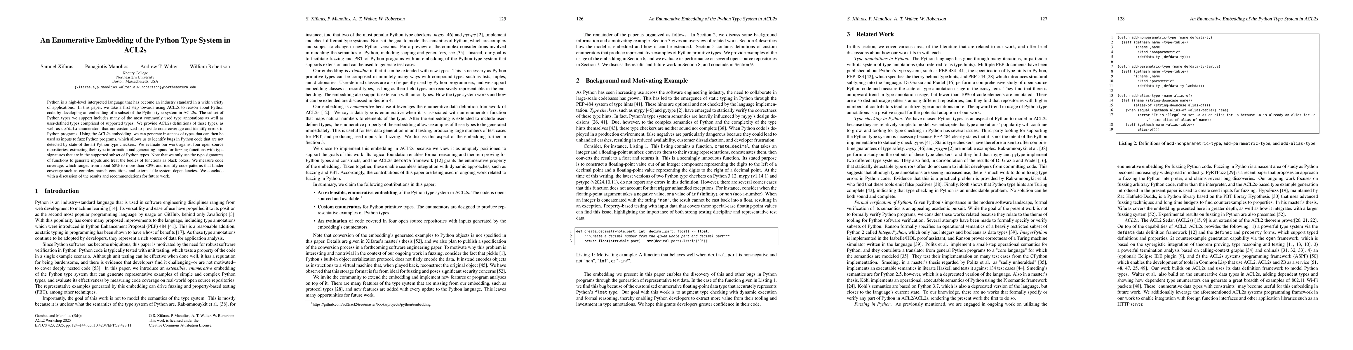 Python is a high-level interpreted language that has become an industry standard in a wide variety of applications. In this paper, we take a first step towards using ACL2s to reason about Python code by developing an embedding of a subset of the Python type system in ACL2s. The subset of Python types we support includes many of the most commonly used type annotations as well as user-defined types comprised of supported types. We provide ACL2s definitions of these types, as well as defdata enumerators that are customized to provide code coverage and identify errors in Python programs. Using the ACL2s embedding, we can generate instances of types that can then be used as inputs to fuzz Python programs, which allows us to identify bugs in Python code that are not detected by state-of-the-art Python type checkers. We evaluate our work against four open-source repositories, extracting their type information and generating inputs for fuzzing functions with type signatures that are in the supported subset of Python types. Note that we only use the type signatures of functions to generate inputs and treat the bodies of functions as black boxes. We measure code coverage, which ranges from about 68% to more than 80%, and identify code patterns that hinder coverage such as complex branch conditions and external file system dependencies. We conclude with a discussion of the results and recommendations for future work.