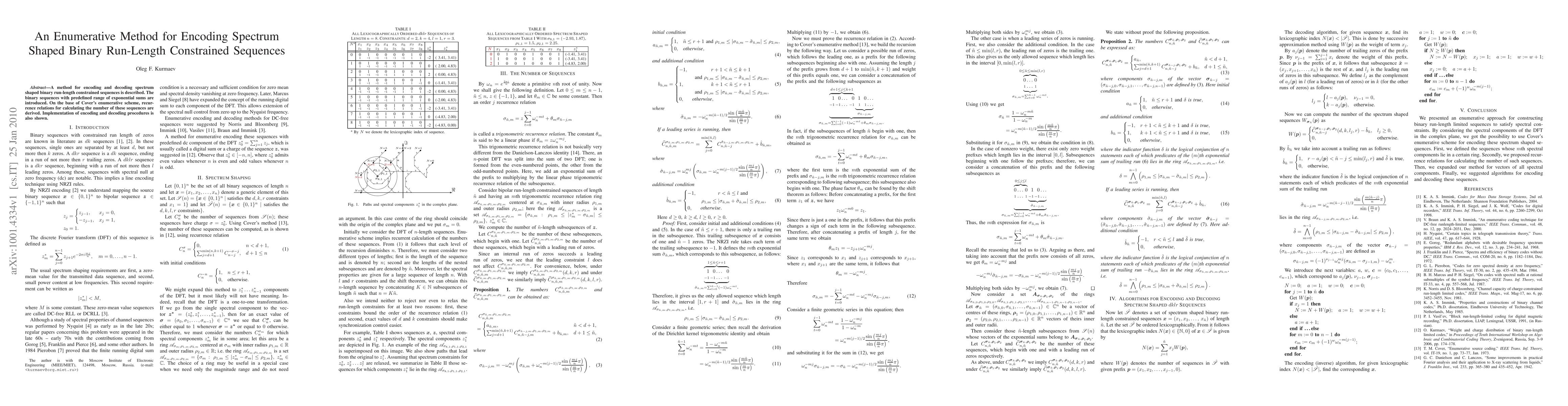 This paper presents an enumerative method for encoding and decoding spectrum shaped binary run-length constrained sequences, leveraging Cover's scheme to derive recurrence relations for sequence enumeration and demonstrating practical implementation of the encoding and decoding procedures.