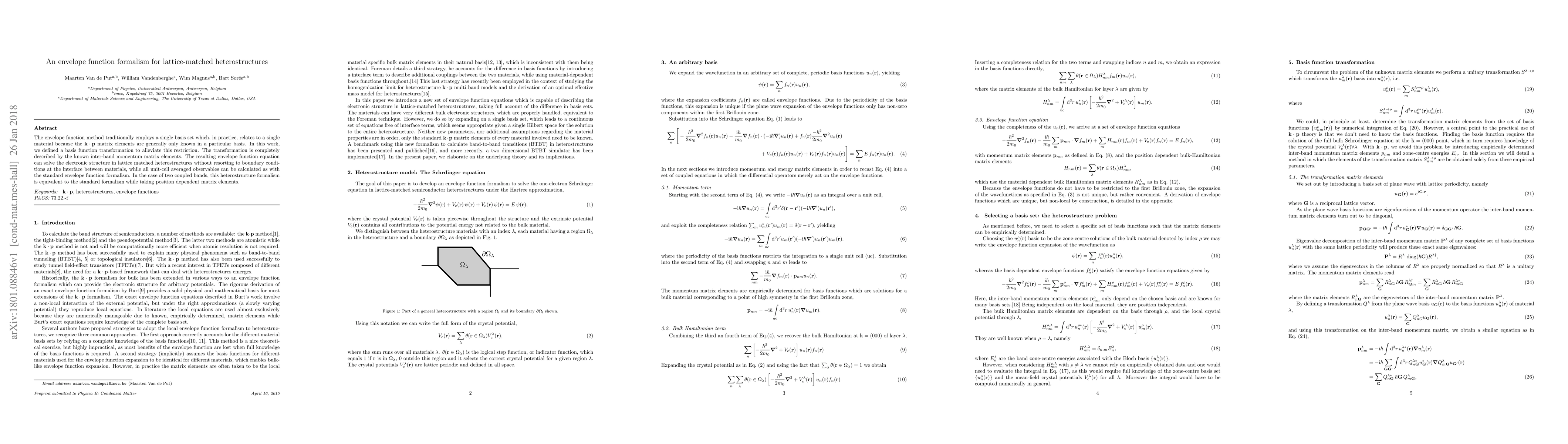 The envelope function method traditionally employs a single basis set which, in practice, relates to a single material because the $k\cdot p$ matrix elements are generally only known in a particular basis. In this work, we defined a basis function transformation to alleviate this restriction. The transformation is completely described by the known inter-band momentum matrix elements. The resulting envelope function equation can solve the electronic structure in lattice matched heterostructures without resorting to boundary conditions at the interface between materials, while all unit-cell averaged observables can be calculated as with the standard envelope function formalism. In the case of two coupled bands, this heterostructure formalism is equivalent to the standard formalism while taking position dependent matrix elements.
