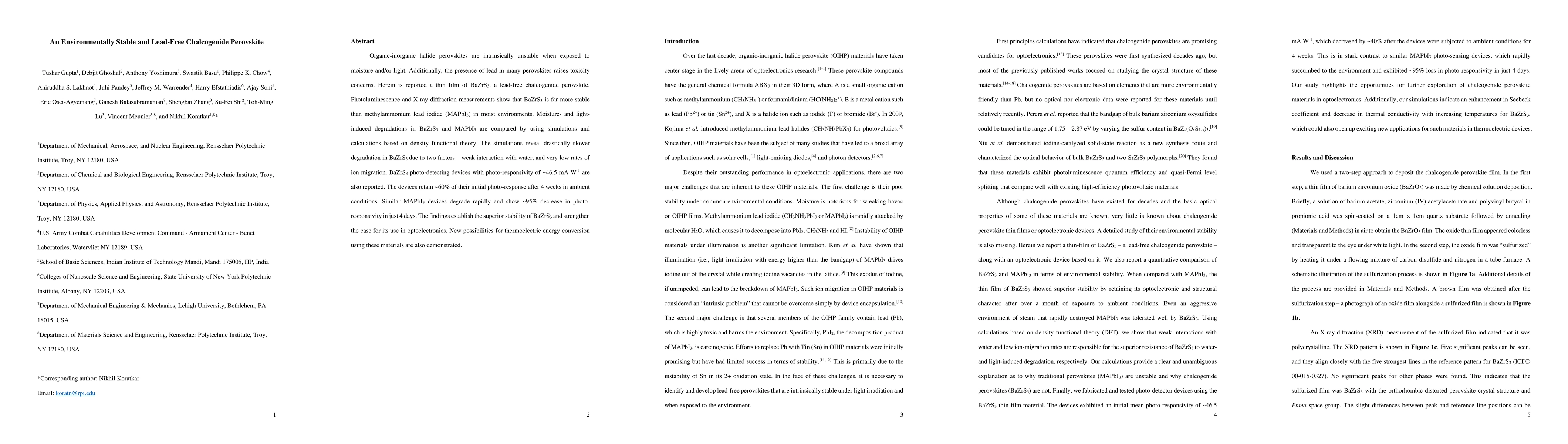 Researchers have developed a lead-free chalcogenide perovskite, BaZrS3, that is more stable in moist environments than traditional perovskites like MAPbI3, with potential applications in optoelectronics and thermoelectric energy conversion.