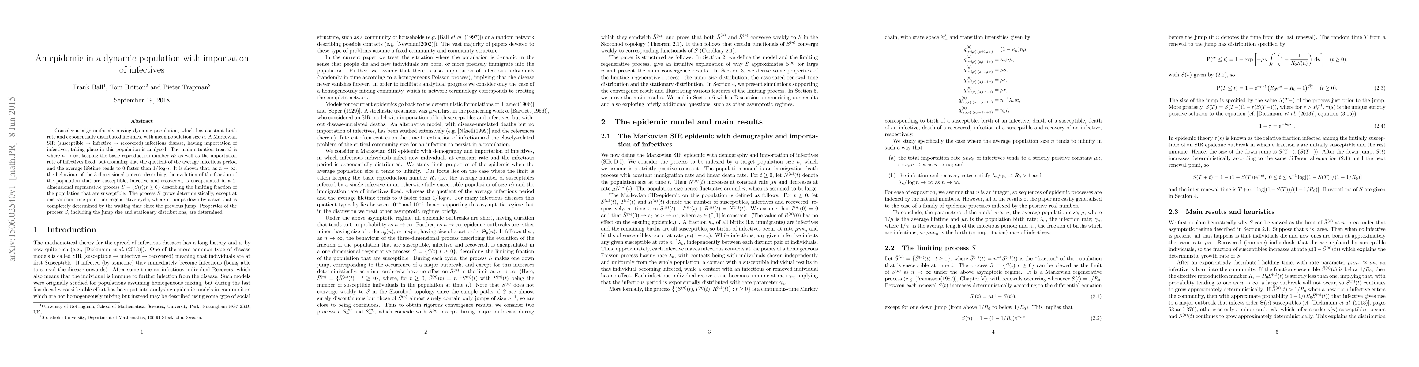 Consider a large uniformly mixing dynamic population, which has constant birth rate and exponentially distributed lifetimes, with mean population size $n$. A Markovian SIR (susceptible $\to$ infective $\to$ recovered) infectious disease, having importation of infectives, taking place in this population is analysed. The main situation treated is where $n\to\infty$, keeping the basic reproduction number $R_0$ as well as the importation rate of infectives fixed, but assuming that the quotient of the average infectious period and the average lifetime tends to 0 faster than $1/\log n$. It is shown that, as $ n \to \infty$, the behaviour of the 3-dimensional process describing the evolution of the fraction of the population that are susceptible, infective and recovered, is encapsulated in a 1-dimensional regenerative process $S=\{ S(t);t\ge 0\}$ describing the limiting fraction of the population that are susceptible. The process $S$ grows deterministically, except at one random time point per regenerative cycle, where it jumps down by a size that is completely determined by the waiting time since the previous jump. Properties of the process $S$, including the jump size and stationary distributions, are determined.