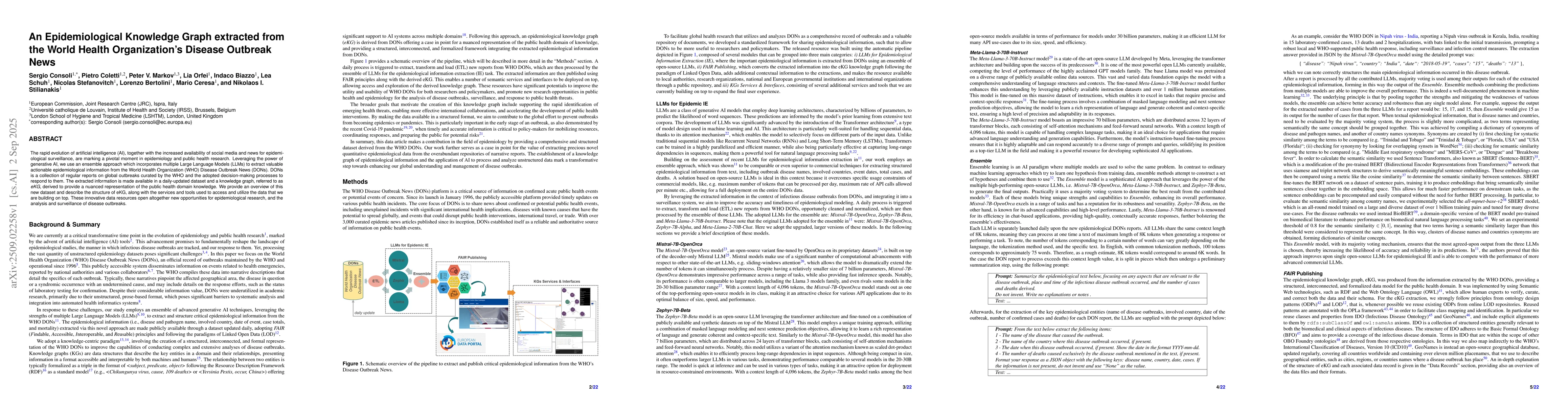 The rapid evolution of artificial intelligence (AI), together with the increased availability of social media and news for epidemiological surveillance, are marking a pivotal moment in epidemiology and public health research. Leveraging the power of generative AI, we use an ensemble approach which incorporates multiple Large Language Models (LLMs) to extract valuable actionable epidemiological information from the World Health Organization (WHO) Disease Outbreak News (DONs). DONs is a collection of regular reports on global outbreaks curated by the WHO and the adopted decision-making processes to respond to them. The extracted information is made available in a daily-updated dataset and a knowledge graph, referred to as eKG, derived to provide a nuanced representation of the public health domain knowledge. We provide an overview of this new dataset and describe the structure of eKG, along with the services and tools used to access and utilize the data that we are building on top. These innovative data resources open altogether new opportunities for epidemiological research, and the analysis and surveillance of disease outbreaks.