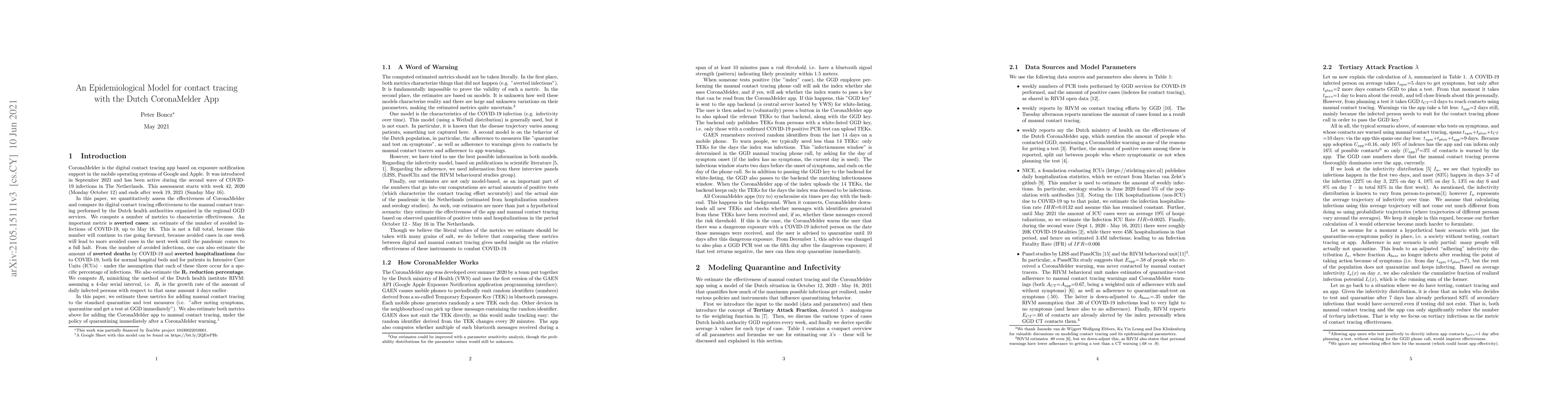 We present an epidemiological model for the effectiveness of CoronaMelder, the Dutch digital contact tracing app developed on top of the Google/Apple Exposure Notification framework. We compare the effectiveness of CoronaMelder with manual contract tracing on a number of metrics. CoronaMelder turns out to have a small but noticeable positive influence in slowing down the COVID-19 pandemic, an effect that will become more pronounced in an opened-up society where adoption of CoronaMelder is increased.