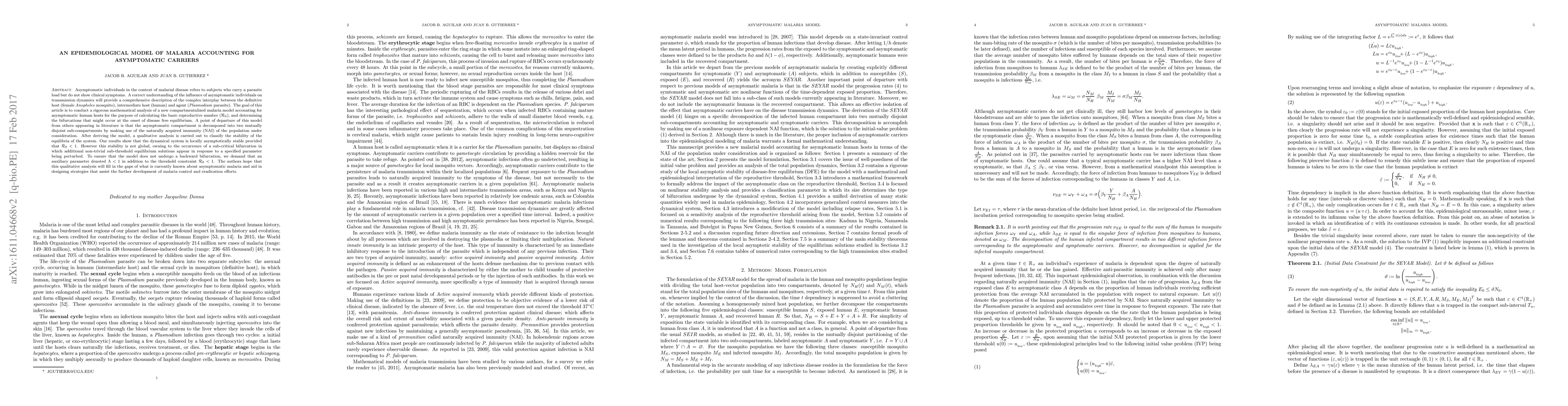 Researchers developed a new malaria model that accounts for asymptomatic carriers, finding that stability is local but not global under certain conditions. The model predicts bifurcations in disease dynamics when specific parameters are met.