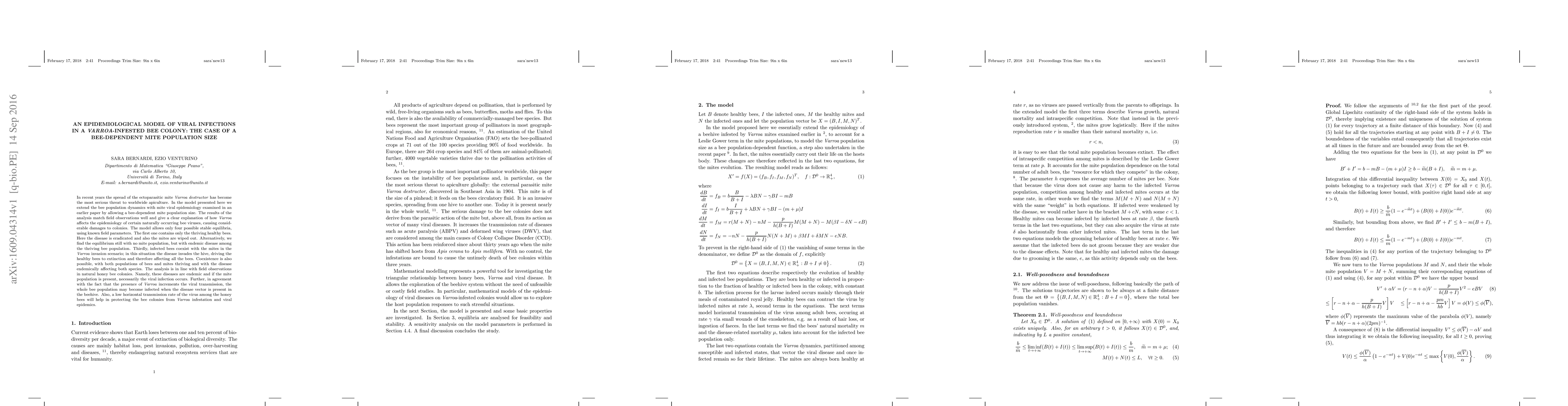 This paper develops an epidemiological model to study the impact of Varroa destructor mites on bee population dynamics and viral infections, revealing four stable equilibria: eradication of disease and mites, endemic disease without mites, Varroa-driven disease with mite presence, and coexistence of both mites and disease. The model aligns with field observations, showing that Varroa increases viral transmission and low horizontal transmission rates can mitigate epidemics.