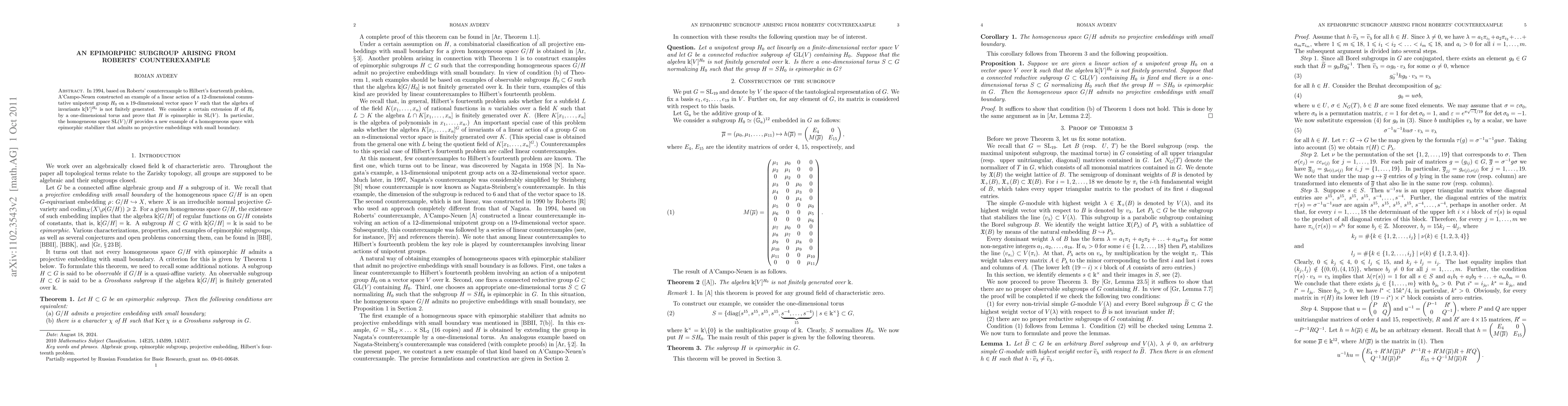 In 1994, based on Roberts' counterexample to Hilbert's fourteenth problem, A'Campo-Neuen constructed an example of a linear action of a 12-dimensional commutative unipotent group H_0 on a 19-dimensional vector space V such that the algebra of invariants k[V]^{H_0} is not finitely generated. We consider a certain extension H of H_0 by a one-dimensional torus and prove that H is epimorphic in SL(V). In particular, the homogeneous space SL(V)/H provides a new example of a homogeneous space with epimorphic stabilizer that admits no projective embeddings with small boundary.
