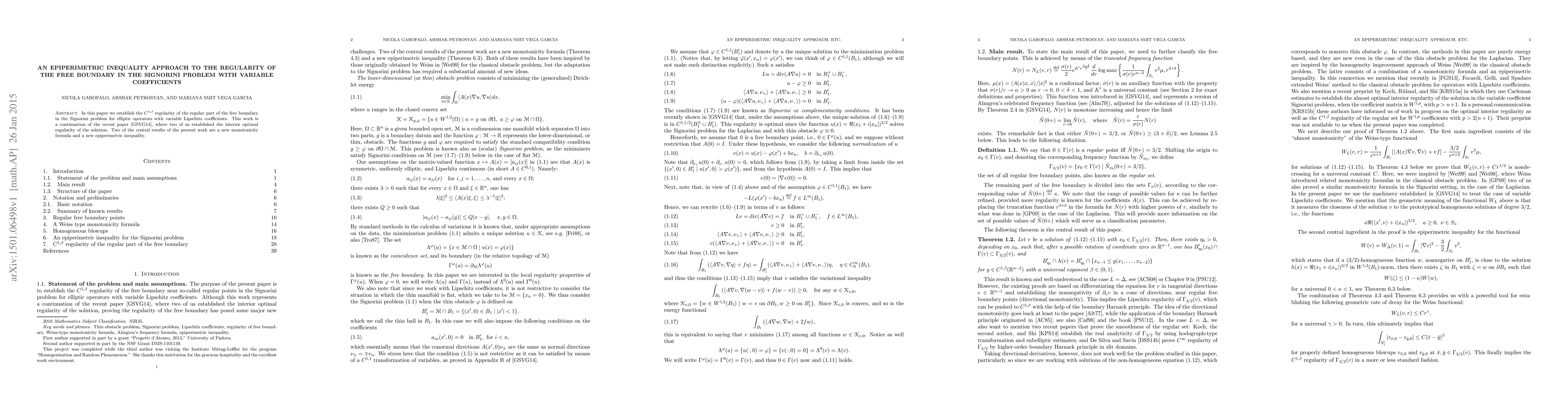 This paper establishes $C^{1,\beta}$ regularity for the free boundary in the Signorini problem for elliptic operators with variable Lipschitz coefficients, utilizing a new monotonicity formula and an epiperimetric inequality. This builds on prior work establishing interior optimal regularity of the solution.