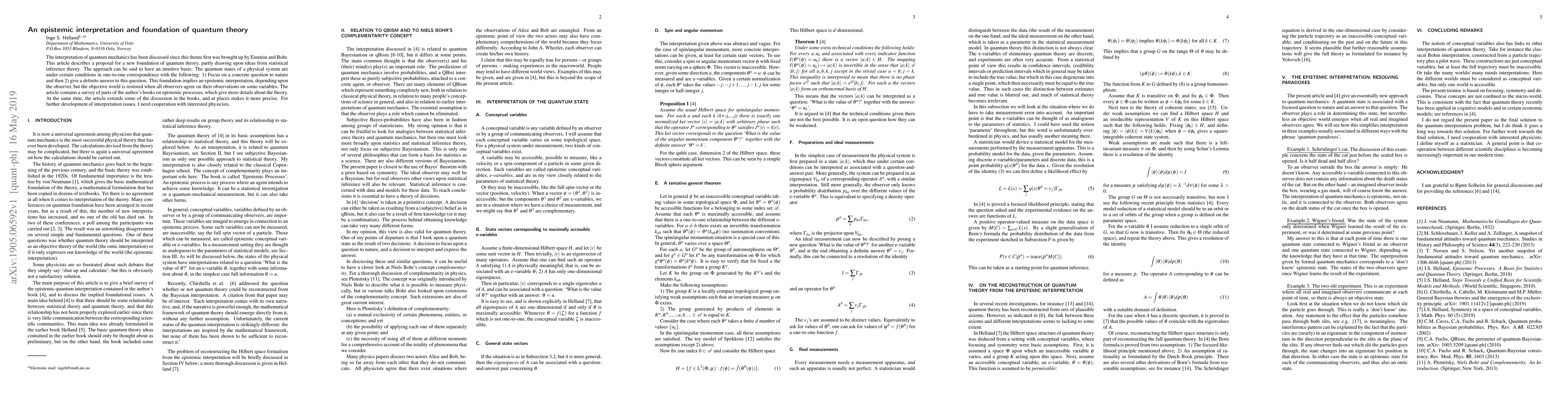 The interpretation of quantum mechanics has been discussed since this theme first was brought up by Einstein and Bohr. This article describes a proposal for a new foundation of quantum theory, partly drawing upon ideas from statistical inference theory. The approach can be said to have an intuitive basis: The quantum states of a physical system are under certain conditions in one-to-one correspondence with the following: 1. Focus on a concrete question to nature and then 2. Give a definite answer to this question. This foundation implies an epistemic interpretation, depending upon the observer, but the objective world is restored when all observers agree on their observations on some variables. The article contains a survey of parts of the authors books on epistemic processes, which give more details about the theory. At the same time, the article extends some of the discussion in the books, and at places makes it more precise.