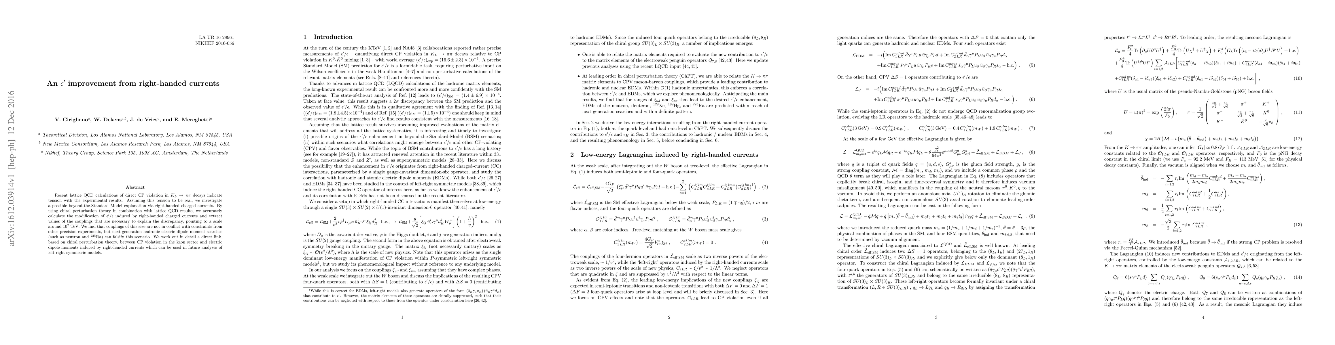 This paper investigates a beyond-the-Standard Model explanation for the observed tension in lattice QCD calculations of direct CP violation in $K_L \to \pi \pi$ decays using right-handed charged currents. It finds that such currents could modify $\epsilon'/\epsilon$ and suggests a scale around $10^2$ TeV for these interactions, while next-generation electric dipole moment searches may falsify this scenario.