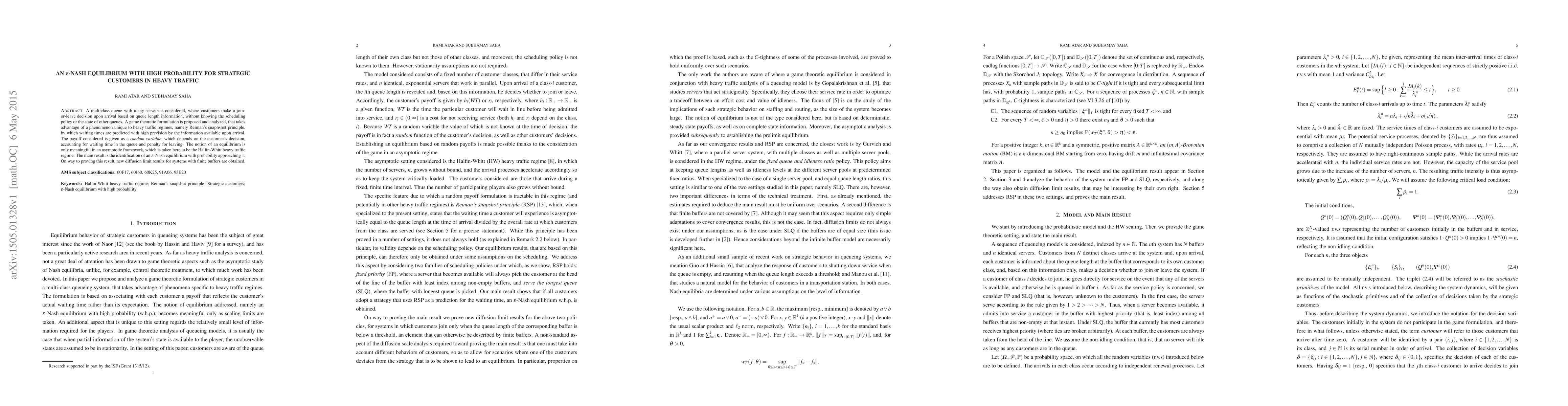 A multiclass queue with many servers is considered, where customers make a join-or-leave decision upon arrival based on queue length information, without knowing the scheduling policy or the state of other queues. A game theoretic formulation is proposed and analyzed, that takes advantage of a phenomenon unique to heavy traffic regimes, namely Reiman's snaphshot principle, by which waiting times are predicted with high precision by the information available upon arrival. The payoff considered is given as a random variable, which depends on the customer's decision, accounting for waiting time in the queue and penalty for leaving. The notion of an equilibrium is only meaningful in an asymptotic framework, which is taken here to be the Halfin-Whitt heavy traffic regime. The main result is the identification of an $\epsilon$-Nash equilibrium with probability approaching 1. On way to proving this result, new diffusion limit results for systems with finite buffers are obtained.