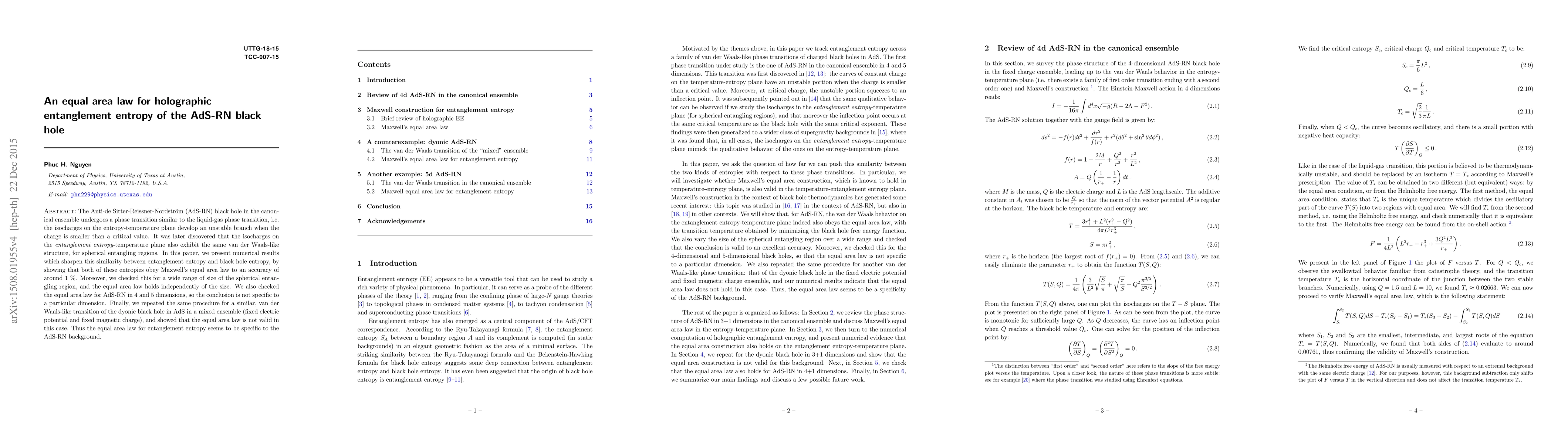 The Anti-de Sitter-Reissner-Nordstrom (AdS-RN) black hole in the canonical ensemble undergoes a phase transition similar to the liquid-gas phase transition, i.e. the isocharges on the entropy-temperature plane develop an unstable branch when the charge is smaller than a critical value. It was later discovered that the isocharges on the entanglement entropy-temperature plane also exhibit the same van der Waals-like structure, for spherical entangling regions. In this paper, we present numerical results which sharpen this similarity between entanglement entropy and black hole entropy, by showing that both of these entropies obey Maxwell's equal area law to an accuracy of around 1 %. Moreover, we checked this for a wide range of size of the spherical entangling region, and the equal area law holds independently of the size. We also checked the equal area law for AdS-RN in 4 and 5 dimensions, so the conclusion is not specific to a particular dimension. Finally, we repeated the same procedure for a similar, van der Waals-like transition of the dyonic black hole in AdS in a mixed ensemble (fixed electric potential and fixed magnetic charge), and showed that the equal area law is not valid in this case. Thus the equal area law for entanglement entropy seems to be specific to the AdS-RN background.