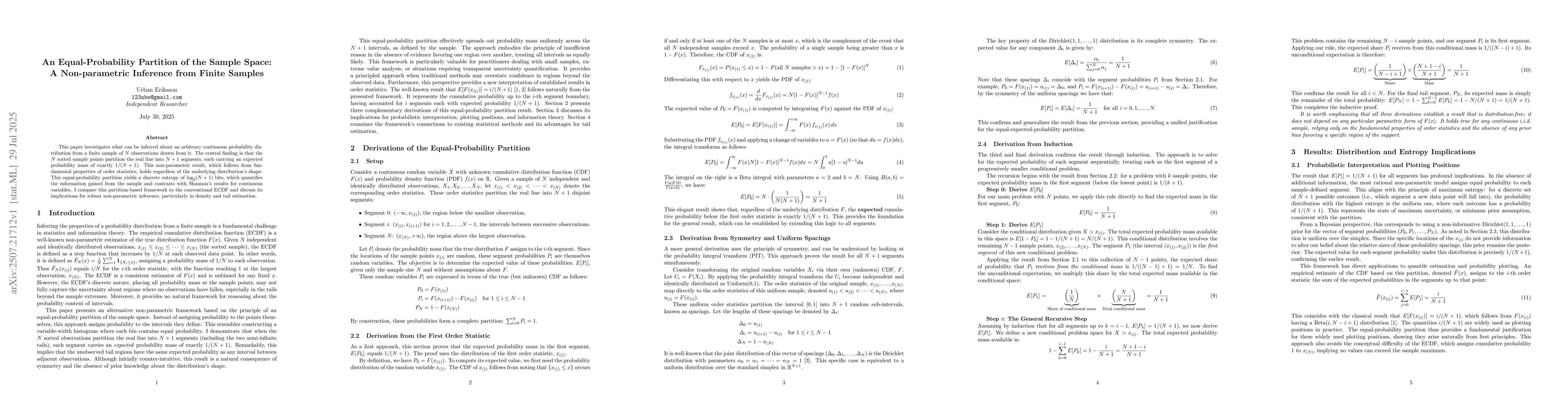 This paper investigates what can be inferred about an arbitrary continuous probability distribution from a finite sample of $N$ observations drawn from it. The central finding is that the $N$ sorted sample points partition the real line into $N+1$ segments, each carrying an expected probability mass of exactly $1/(N+1)$. This non-parametric result, which follows from fundamental properties of order statistics, holds regardless of the underlying distribution's shape. This equal-probability partition yields a discrete entropy of $\log_2(N+1)$ bits, which quantifies the information gained from the sample and contrasts with Shannon's results for continuous variables. I compare this partition-based framework to the conventional ECDF and discuss its implications for robust non-parametric inference, particularly in density and tail estimation.
