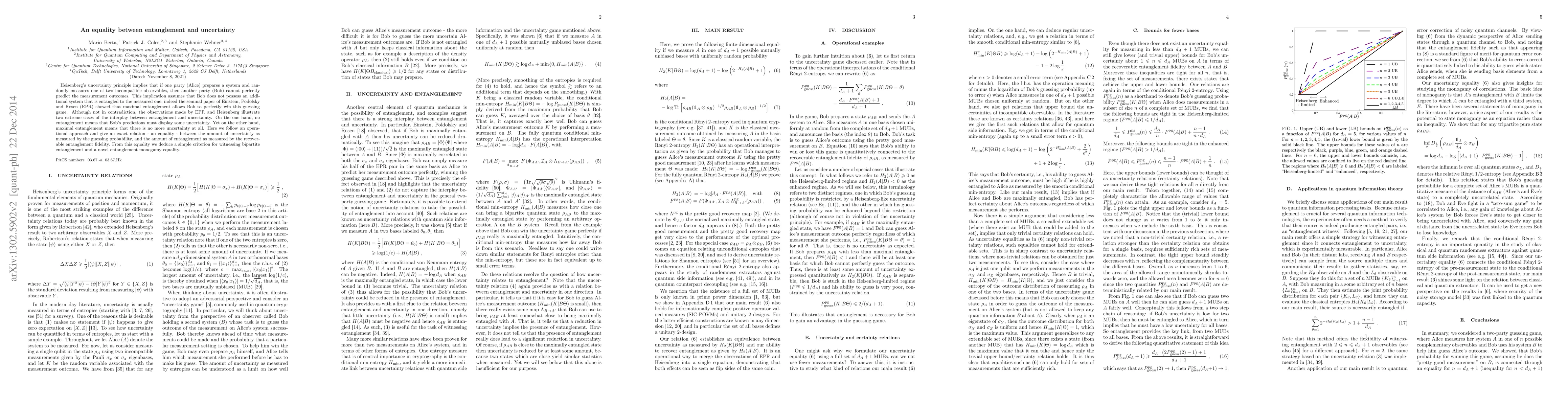 Heisenberg's uncertainty principle implies that if one party (Alice) prepares a system and randomly measures one of two incompatible observables, then another party (Bob) cannot perfectly predict the measurement outcomes. This implication assumes that Bob does not possess an additional system that is entangled to the measured one; indeed the seminal paper of Einstein, Podolsky and Rosen (EPR) showed that maximal entanglement allows Bob to perfectly win this guessing game. Although not in contradiction, the observations made by EPR and Heisenberg illustrate two extreme cases of the interplay between entanglement and uncertainty. On the one hand, no entanglement means that Bob's predictions must display some uncertainty. Yet on the other hand, maximal entanglement means that there is no more uncertainty at all. Here we follow an operational approach and give an exact relation - an equality - between the amount of uncertainty as measured by the guessing probability, and the amount of entanglement as measured by the recoverable entanglement fidelity. From this equality we deduce a simple criterion for witnessing bipartite entanglement and a novel entanglement monogamy equality.