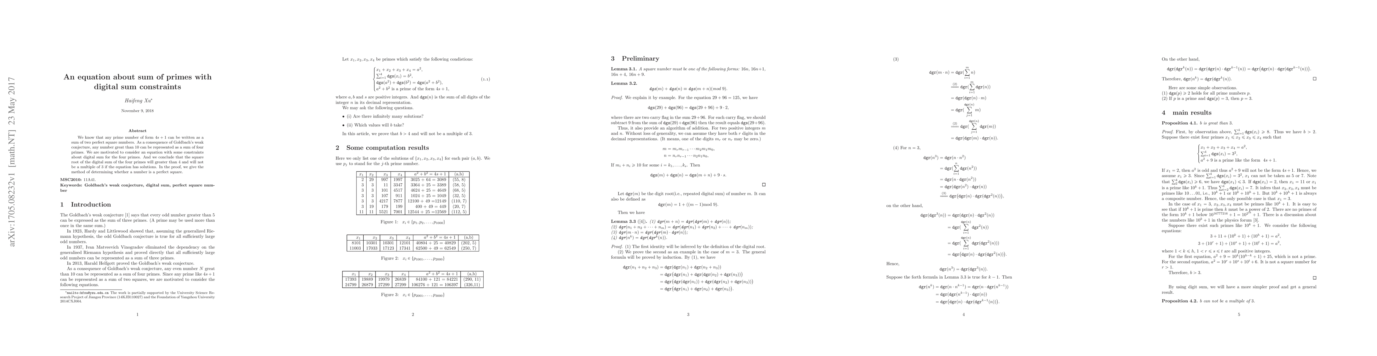 We know that any prime number of form $4s+1$ can be written as a sum of two perfect square numbers. As a consequence of Goldbach's weak conjecture, any number great than $10$ can be represented as a sum of four primes. We are motivated to consider an equation with some constraints about digital sum for the four primes. And we conclude that the square root of the digital sum of the four primes will greater than $4$ and will not be a multiple of $3$ if the equation has solutions. In the proof, we give the method of determining whether a number is a perfect square.
