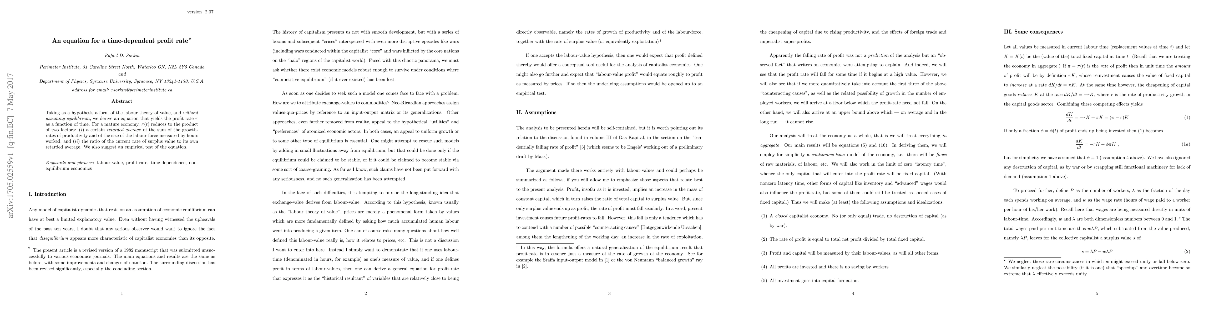 Taking as a hypothesis a form of the labour theory of value, and $without$ $assuming$ $equilibrium$, we derive an equation that yields the profit-rate $\pi$ as a function of time. For a mature economy, $\pi(t)$ reduces to the product of two factors: ($i$) a certain $retarded$ $average$ of the sum of the growth-rates of productivity and of the size of the labour-force measured by hours worked, and ($ii$) the ratio of the current rate of surplus value to its own retarded average. We also suggest an empirical test of the equation.