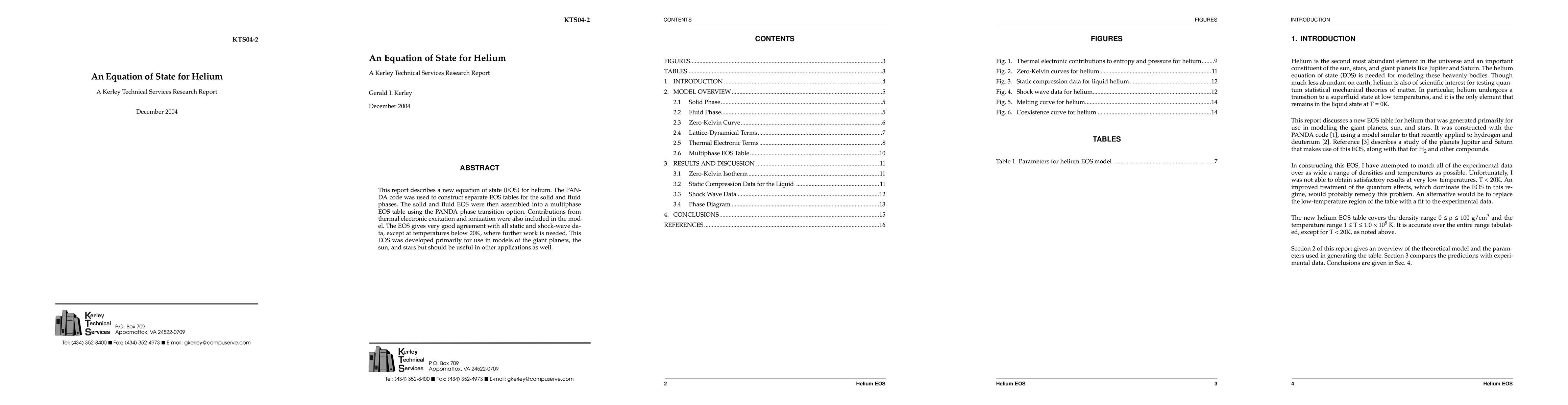 This report describes a new equation of state (EOS) for helium. The PANDA code was used to construct separate EOS tables for the solid and fluid phases. The solid and fluid EOS were then assembled into a multiphase EOS table using the PANDA phase transition option. Contributions from thermal electronic excitation and ionization were also included in the model. The EOS gives very good agreement with all static and shock-wave data, except at temperatures below 20K, where further work is needed. This EOS was developed primarily for use in models of the giant planets, the sun, and stars but should be useful in other applications as well.