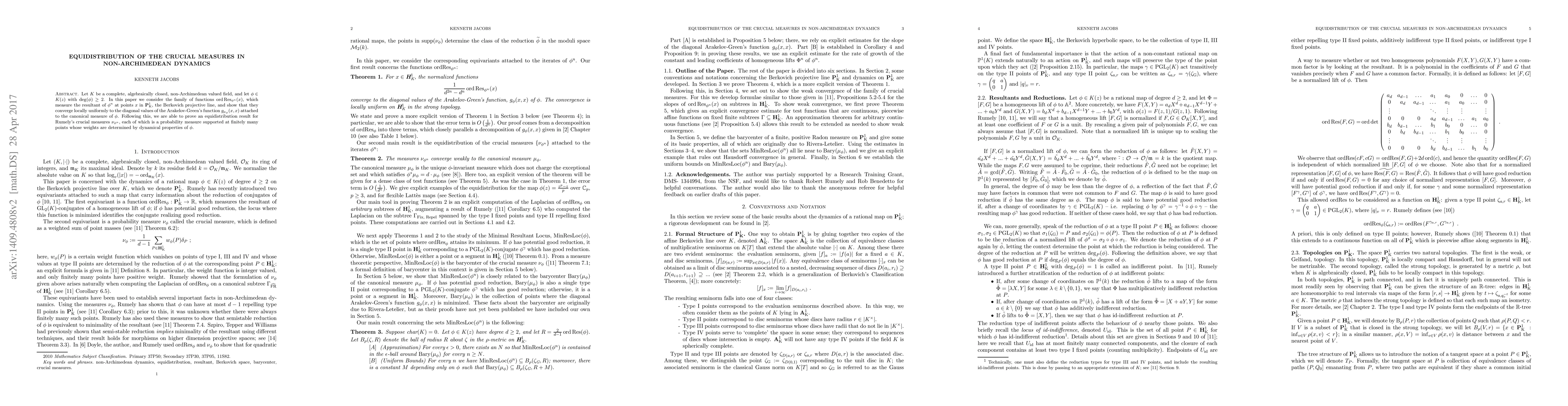 Let $K$ be a complete, algebraically closed, non-Archimedean valued field, and let $\phi\in K(z)$ with $\textrm{deg}(\phi) \geq 2$. In this paper we consider the family of functions $\textrm{ordRes}_{\phi^n}(x)$, which measure the resultant of $\phi^n$ at points $x$ in $\textbf{P}^1_{\textrm{K}}$, the Berkovich projective line, and show that they converge locally uniformly to the diagonal values of the Arakelov-Green's function $g_{\mu_{\phi}}(x,x)$ attached to the canonical measure of $\phi$. Following this, we are able to prove an equidistribution result for Rumely's crucial measures $\nu_{\phi^n}$, each of which is a probability measure supported at finitely many points whose weights are determined by dynamical properties of $\phi$.