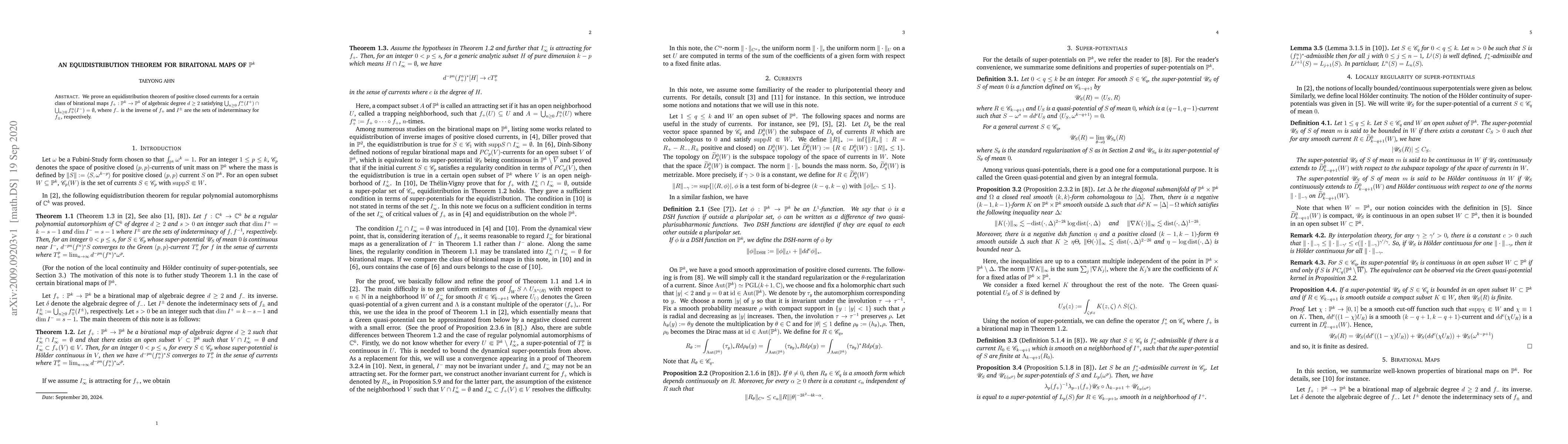This paper proves an equidistribution theorem for positive closed currents under birational maps of projective space $\mathbb{P}^k$ of algebraic degree $d\geq 2$, ensuring the sets of indeterminacy for the forward and inverse maps do not intersect.