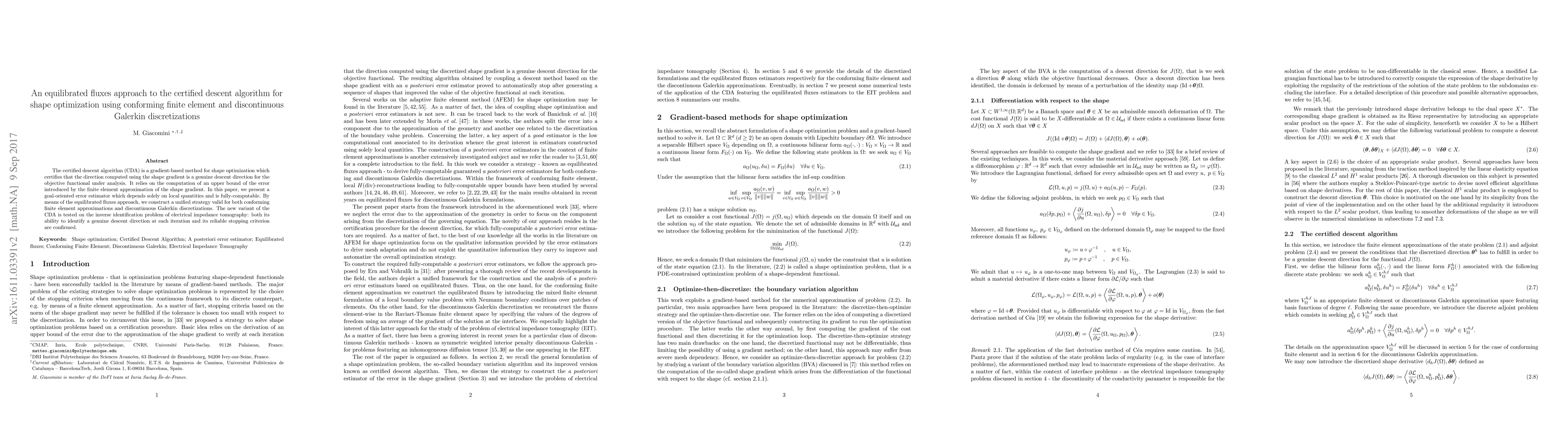 The certified descent algorithm (CDA) is a gradient-based method for shape optimization which certifies that the direction computed using the shape gradient is a genuine descent direction for the objective functional under analysis. It relies on the computation of an upper bound of the error introduced by the finite element approximation of the shape gradient. In this paper, we present a goal-oriented error estimator which depends solely on local quantities and is fully-computable. By means of the equilibrated fluxes approach, we construct a unified strategy valid for both conforming finite element approximations and discontinuous Galerkin discretizations. The new variant of the CDA is tested on the inverse identification problem of electrical impedance tomography: both its ability to identify a genuine descent direction at each iteration and its reliable stopping criterion are confirmed.