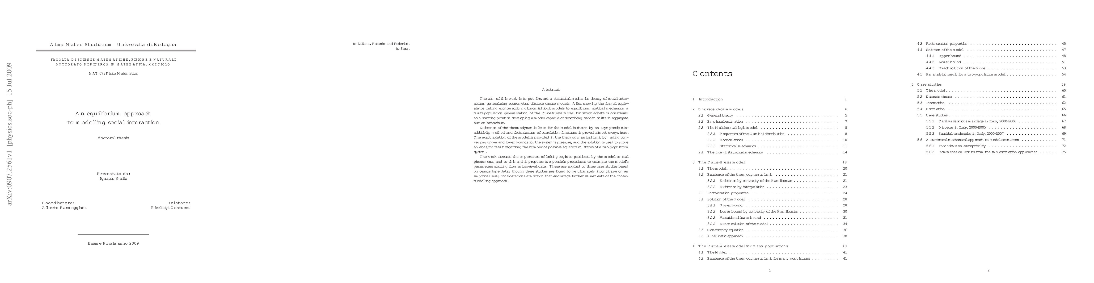 The aim of this work is to put forward a statistical mechanics theory of social interaction, generalizing econometric discrete choice models. After showing the formal equivalence linking econometric multinomial logit models to equilibrium statical mechanics, a multi-population generalization of the Curie-Weiss model for ferromagnets is considered as a starting point in developing a model capable of describing sudden shifts in aggregate human behaviour. Existence of the thermodynamic limit for the model is shown by an asymptotic sub-additivity method and factorization of correlation functions is proved almost everywhere. The exact solution of the model is provided in the thermodynamical limit by finding converging upper and lower bounds for the system's pressure, and the solution is used to prove an analytic result regarding the number of possible equilibrium states of a two-population system. The work stresses the importance of linking regimes predicted by the model to real phenomena, and to this end it proposes two possible procedures to estimate the model's parameters starting from micro-level data. These are applied to three case studies based on census type data: though these studies are found to be ultimately inconclusive on an empirical level, considerations are drawn that encourage further refinements of the chosen modelling approach.