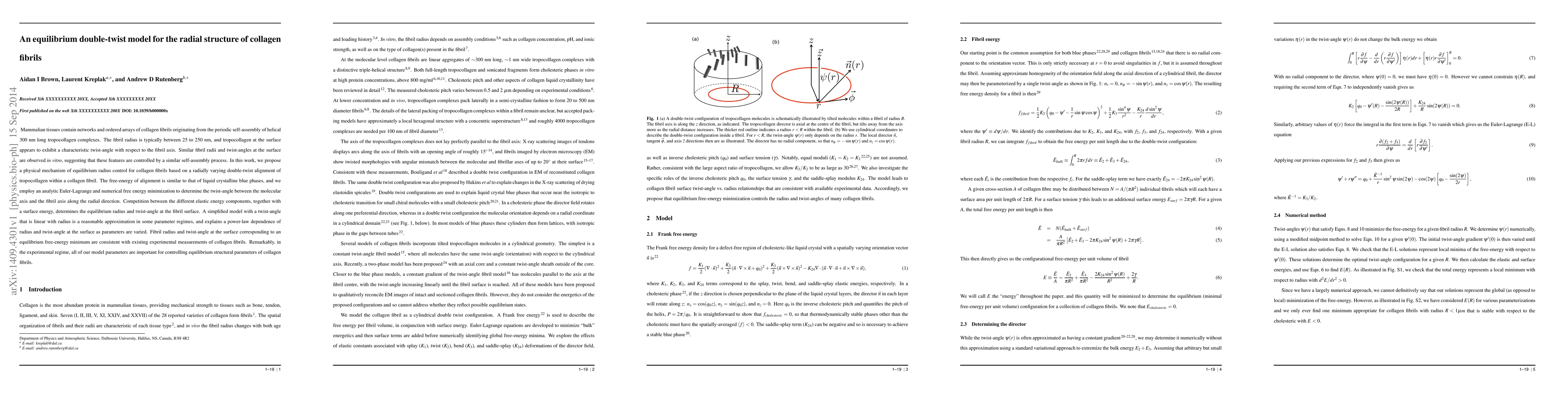 The novelty of this work lies in applying liquid crystal theory to model collagen fibril structure and demonstrating that fibril radius and surface twist angle can be determined by equilibrium free energy considerations, which is consistent with both in vitro and in vivo experimental measurements.