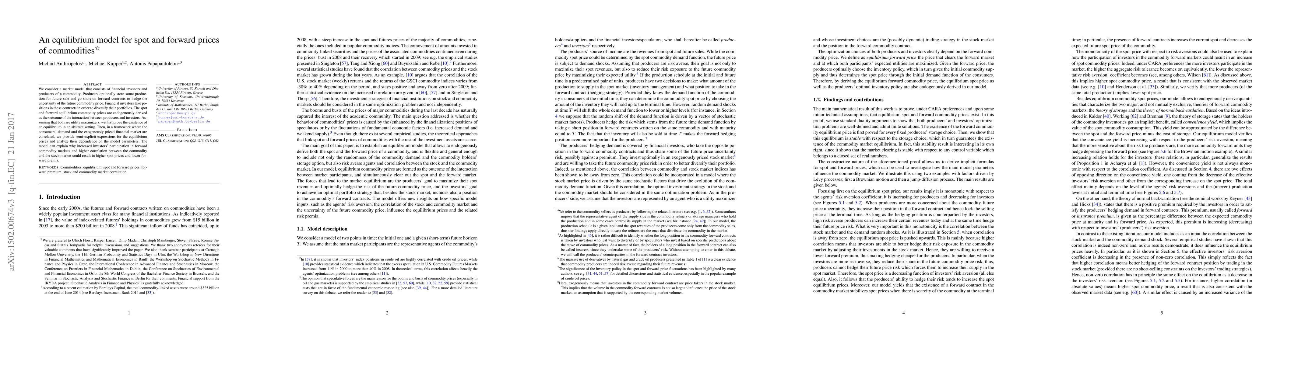 This research presents an equilibrium model for commodity spot and forward prices, involving financial investors and commodity producers. The model demonstrates that increased investor participation in forward markets and higher correlation with stock markets can lead to higher spot prices and lower forward premia, derived through semi-explicit expressions and parameter analysis.
