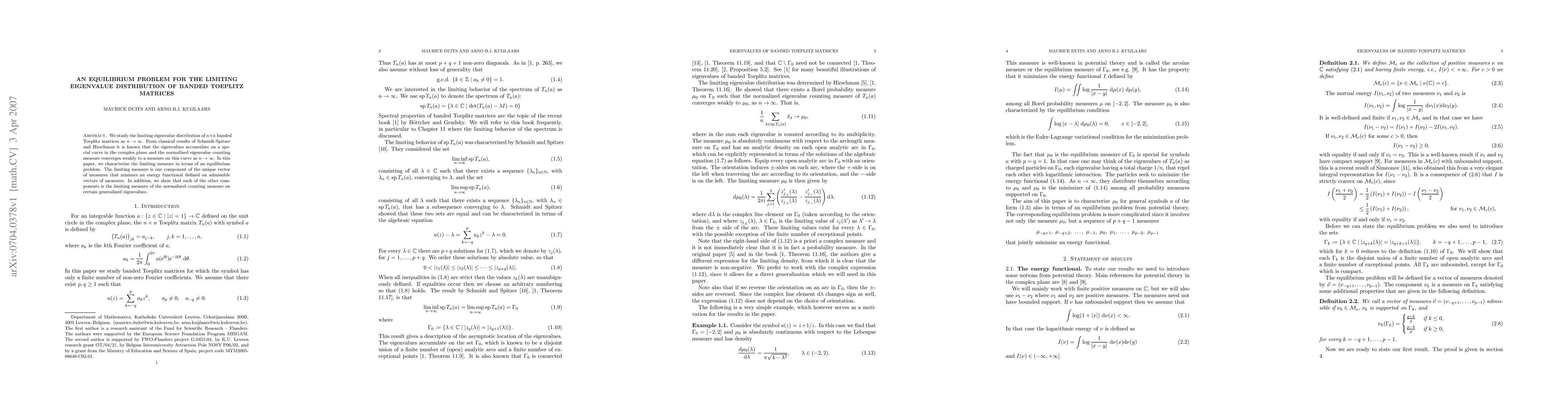 This paper investigates the limiting eigenvalue distribution of large $n\times n$ banded Toeplitz matrices, showing that the normalized eigenvalue counting measure converges to a measure defined by an equilibrium problem. The limiting measure is part of the unique vector of measures that minimizes a specific energy functional.