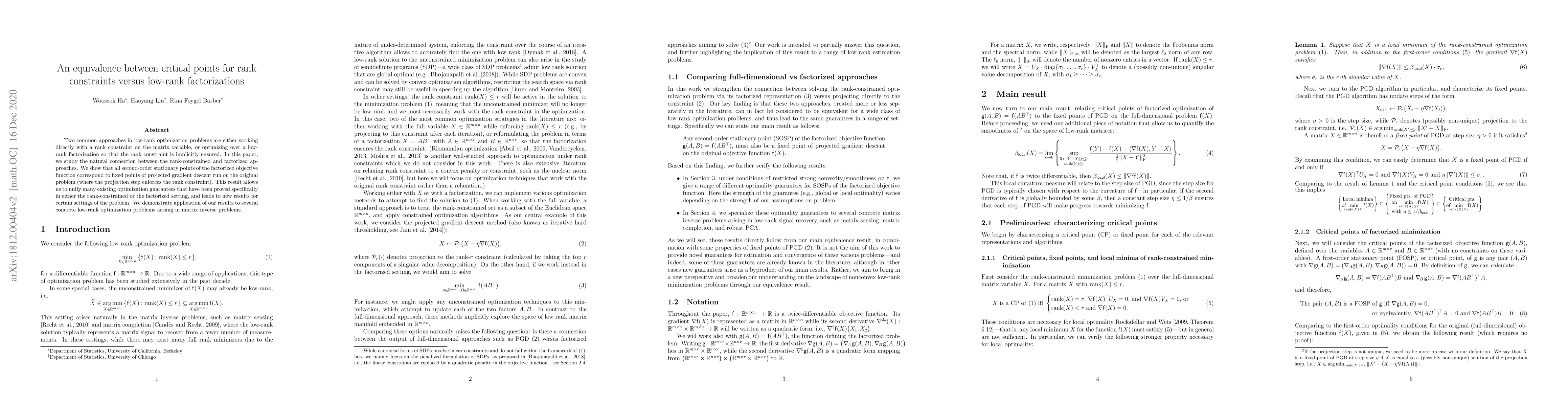 Two common approaches in low-rank optimization problems are either working directly with a rank constraint on the matrix variable, or optimizing over a low-rank factorization so that the rank constraint is implicitly ensured. In this paper, we study the natural connection between the rank-constrained and factorized approaches. We show that all second-order stationary points of the factorized objective function correspond to fixed points of projected gradient descent run on the original problem (where the projection step enforces the rank constraint). This result allows us to unify many existing optimization guarantees that have been proved specifically in either the rank-constrained or the factorized setting, and leads to new results for certain settings of the problem. We demonstrate application of our results to several concrete low-rank optimization problems arising in matrix inverse problems.
