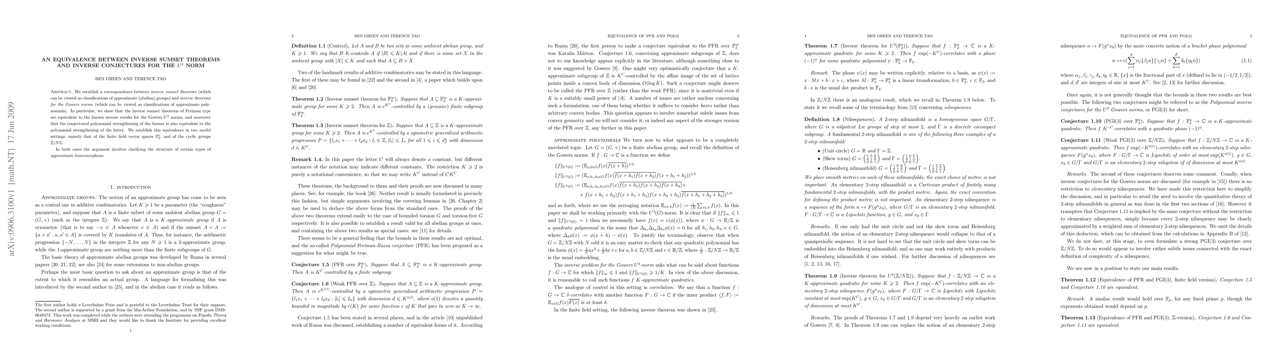This paper establishes an equivalence between inverse sumset theorems for approximate abelian groups and inverse Gowers norms conjectures for polynomials, linking them through model settings of finite field vector spaces and cyclic groups.