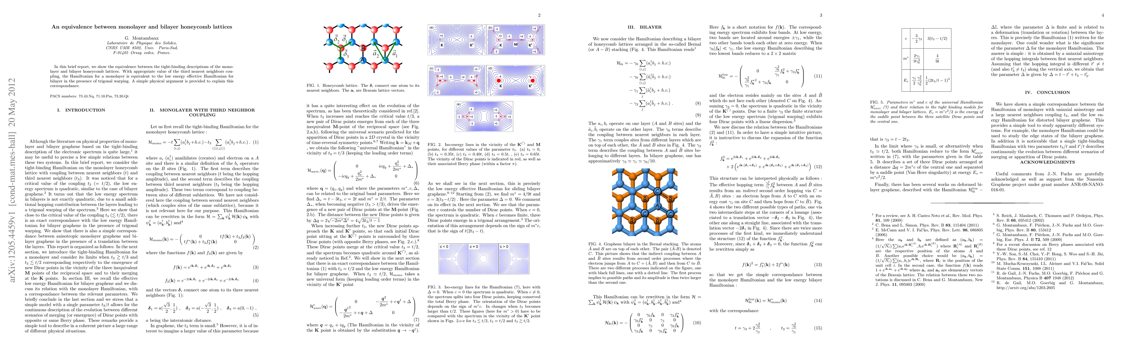 This paper demonstrates that the tight-binding Hamiltonian for a monolayer honeycomb lattice can be made equivalent to that of a bilayer lattice under specific conditions, particularly with the inclusion of third nearest neighbors coupling and trigonal warping, providing a clear physical rationale for this correspondence.