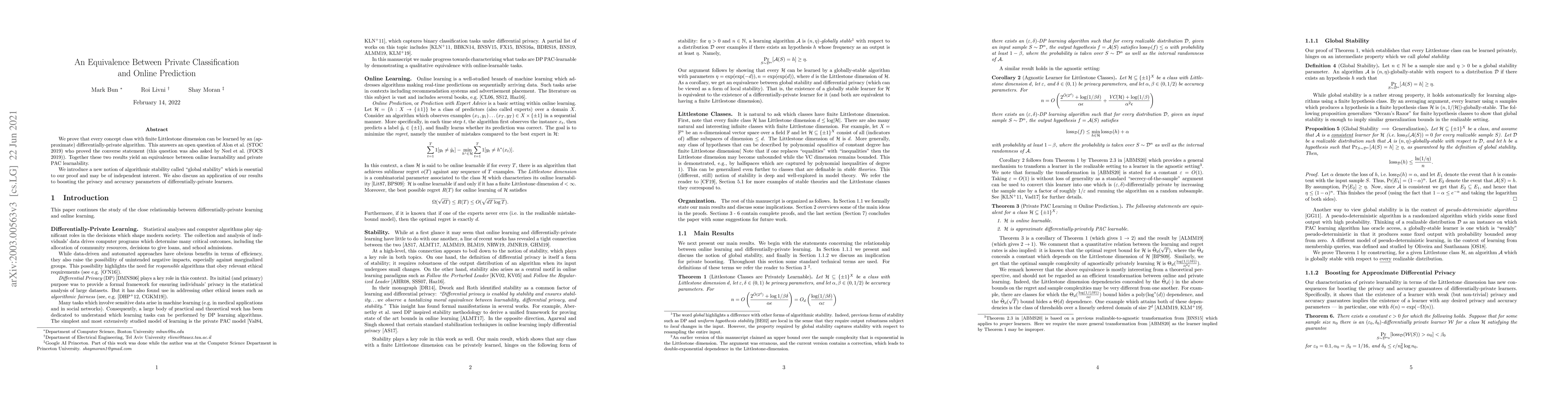 This paper establishes an equivalence between private classification and online prediction, demonstrating that any concept class with finite Littlestone dimension can be learned via differentially-private algorithms. It introduces "global stability" as a key concept in the proof, and discusses applications in enhancing both privacy and accuracy in differentially-private learners.