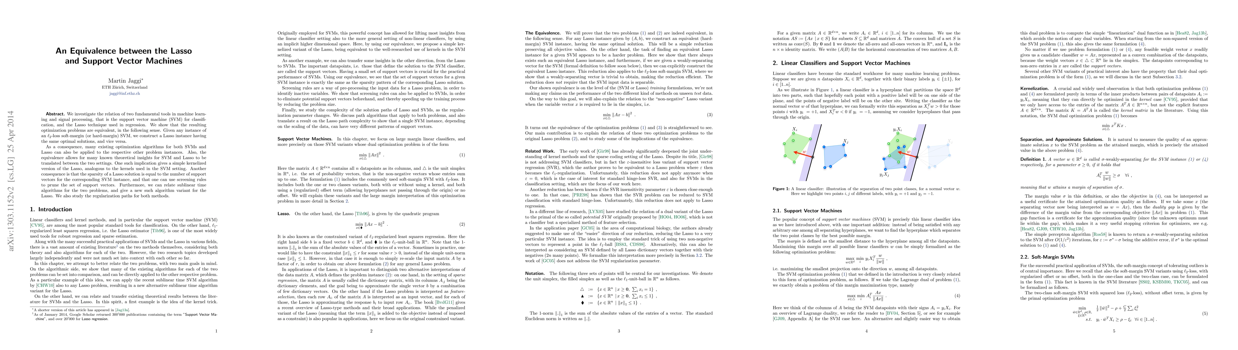 This paper establishes an equivalence between the Lasso and Support Vector Machines (SVM), demonstrating that their optimization problems are fundamentally the same. This equivalence allows optimization algorithms and theoretical insights from one method to be applied to the other, including the development of a kernelized version of the Lasso and the use of screening rules for pruning support vectors.