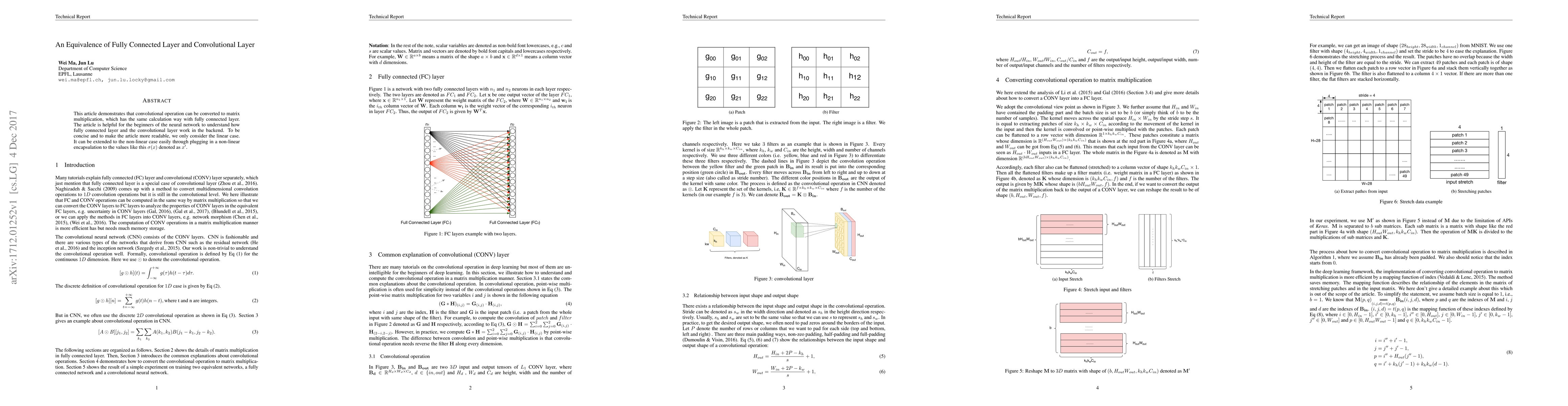This paper shows that convolutional operations can be transformed into matrix multiplication, equivalent to fully connected layers in neural networks. This equivalence aids beginners in understanding the underlying mechanics of convolutional and fully connected layers, focusing on the linear case with potential extension to non-linear transformations.
