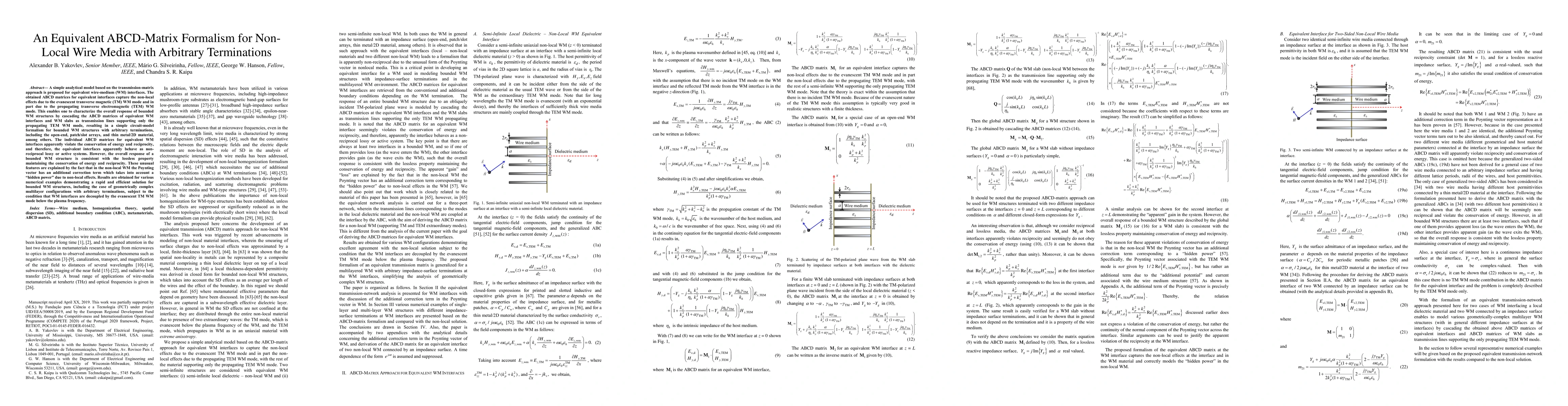 A simple analytical model based on the transmission-matrix approach is proposed for equivalent wire-medium (WM) interfaces. The obtained ABCD matrices for equivalent interfaces capture the non-local effects due to the evanescent transverse magnetic (TM) WM mode and in part due to the propagating transverse electromagnetic (TEM) WM mode. This enables one to characterize the overall response of bounded WM structures by cascading the ABCD matrices of equivalent WM interfaces and WM slabs as transmission lines supporting only the propagating TEM WM mode, resulting in a simple circuit-model formalism for bounded WM structures with arbitrary terminations, including the open-end, patch/slot arrays, and thin metal/2D material, among others. The individual ABCD matrices for equivalent WM interfaces apparently violate the conservation of energy and reciprocity, and therefore, the equivalent interfaces apparently behave as non-reciprocal lossy or active systems. However, the overall response of a bounded WM structure is consistent with the lossless property maintaining the conservation of energy and reciprocity. These unusual features are explained by the fact that in the non-local WM the Poynting vector has an additional correction term which takes into account a "hidden power" due to non-local effects. Results are obtained for various numerical examples demonstrating a rapid and efficient solution for bounded WM structures, including the case of geometrically complex multilayer configurations with arbitrary terminations, subject to the condition that WM interfaces are decoupled by the evanescent TM WM mode below the plasma frequency.