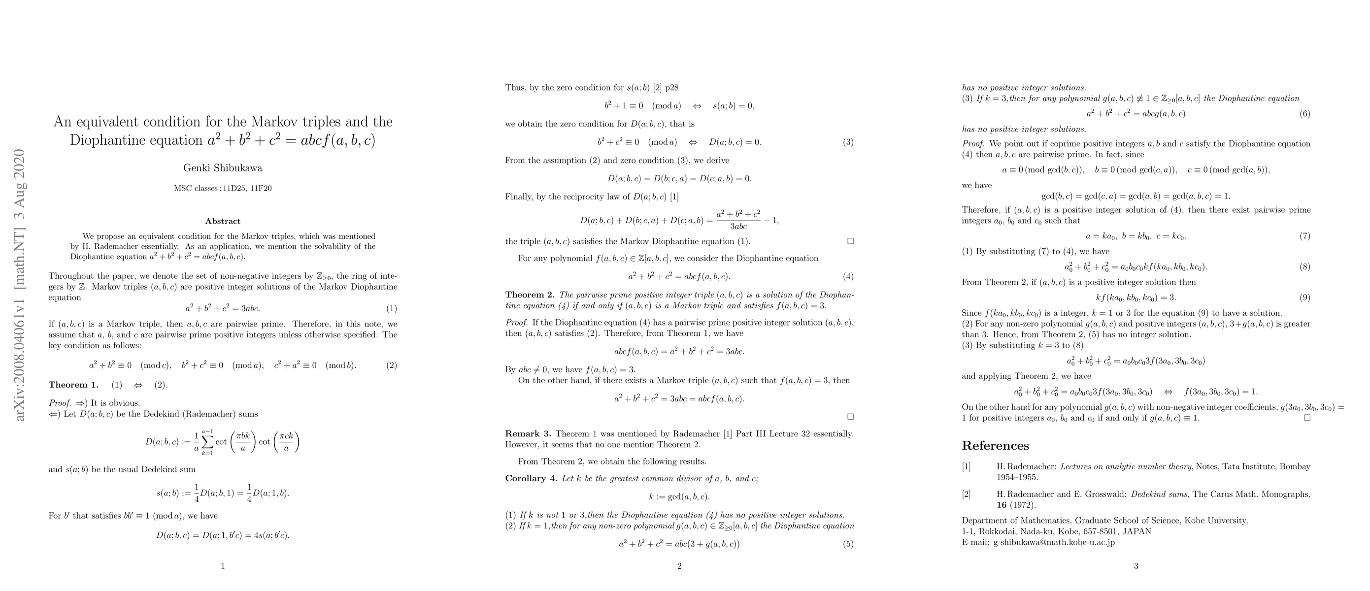We propose an equivalent condition for the Markov triples, which was mentioned by H. Rademacher essentially. As an application, we study the solvability of the Diophantine equation $a^2+b^2+c^2=abcf(a,b,c)$.