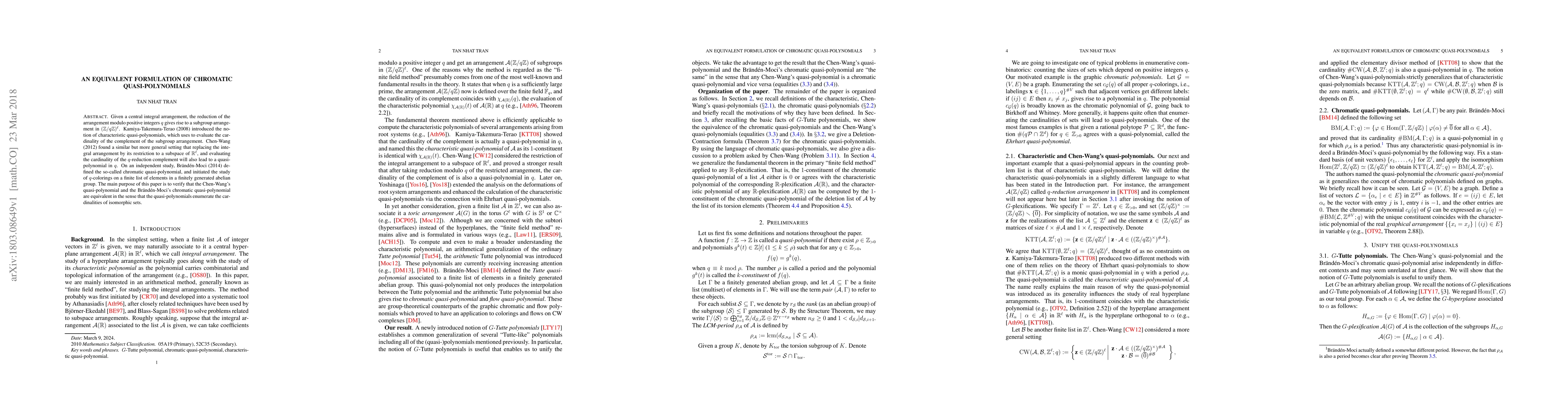Given a central integral arrangement, the reduction of the arrangement modulo positive integers $q$ gives rise to a subgroup arrangement in $(\mathbb{Z}/q\mathbb{Z})^\ell$. Kamiya-Takemura-Terao (2008) introduced the notion of characteristic quasi-polynomials, which uses to evaluate the cardinality of the complement of the subgroup arrangement. Chen-Wang (2012) found a similar but more general setting that replacing the integral arrangement by its restriction to a subspace of $\mathbb{R}^\ell$, and evaluating the cardinality of the $q$-reduction complement will also lead to a quasi-polynomial in $q$. On an independent study, Br\"and\'en-Moci (2014) defined the so-called chromatic quasi-polynomial, and initiated the study of $q$-colorings on a finite list of elements in a finitely generated abelian group. The main purpose of this paper is to verify that the Chen-Wang's quasi-polynomial and the Br\"and\'en-Moci's chromatic quasi-polynomial are equivalent in the sense that the quasi-polynomials enumerate the cardinalities of isomorphic sets.