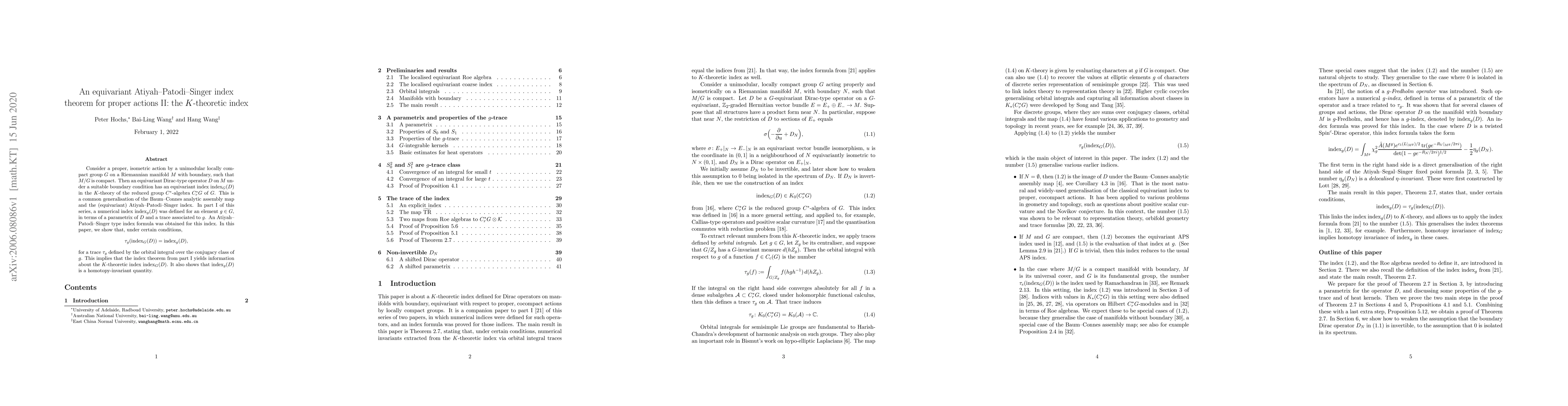 Consider a proper, isometric action by a unimodular locally compact group $G$ on a Riemannian manifold $M$ with boundary, such that $M/G$ is compact. Then an equivariant Dirac-type operator $D$ on $M$ under a suitable boundary condition has an equivariant index $\operatorname{index}_G(D)$ in the $K$-theory of the reduced group $C^*$-algebra $C^*_rG$ of $G$. This is a common generalisation of the Baum-Connes analytic assembly map and the (equivariant) Atiyah-Patodi-Singer index. In part I of this series, a numerical index $\operatorname{index}_g(D)$ was defined for an element $g \in G$, in terms of a parametrix of $D$ and a trace associated to $g$. An Atiyah-Patodi-Singer type index formula was obtained for this index. In this paper, we show that, under certain conditions, $\tau_g(\operatorname{index}_G(D)) = \operatorname{index}_g(D)$, for a trace $\tau_g$ defined by the orbital integral over the conjugacy class of $g$. This implies that the index theorem from part I yields information about the $K$-theoretic index $\operatorname{index}_G(D)$. It also shows that $\operatorname{index}_g(D)$ is a homotopy-invariant quantity.
