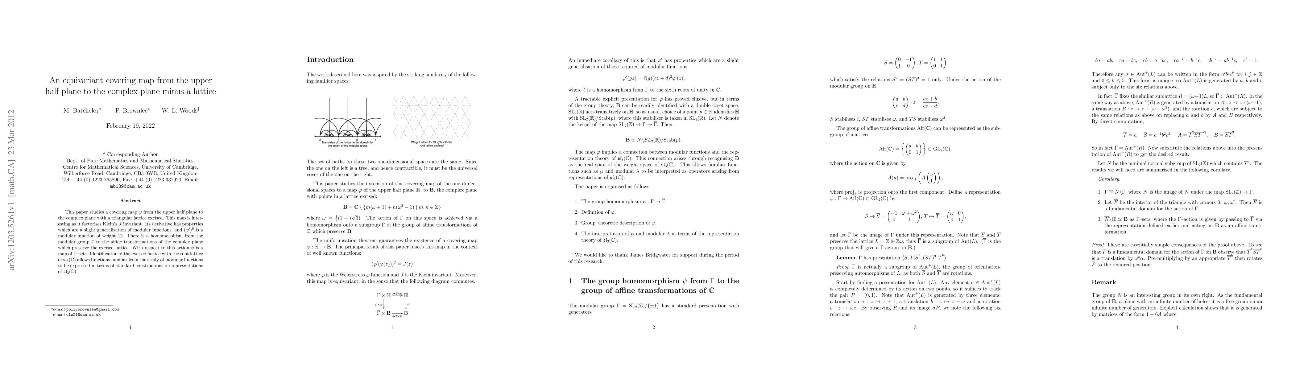 This paper introduces a covering map phi from the upper half plane to the complex plane minus a triangular lattice, which factors Klein's J invariant and generalizes modular functions. The map is equivariant under a homomorphism from the modular group to affine transformations preserving the lattice.