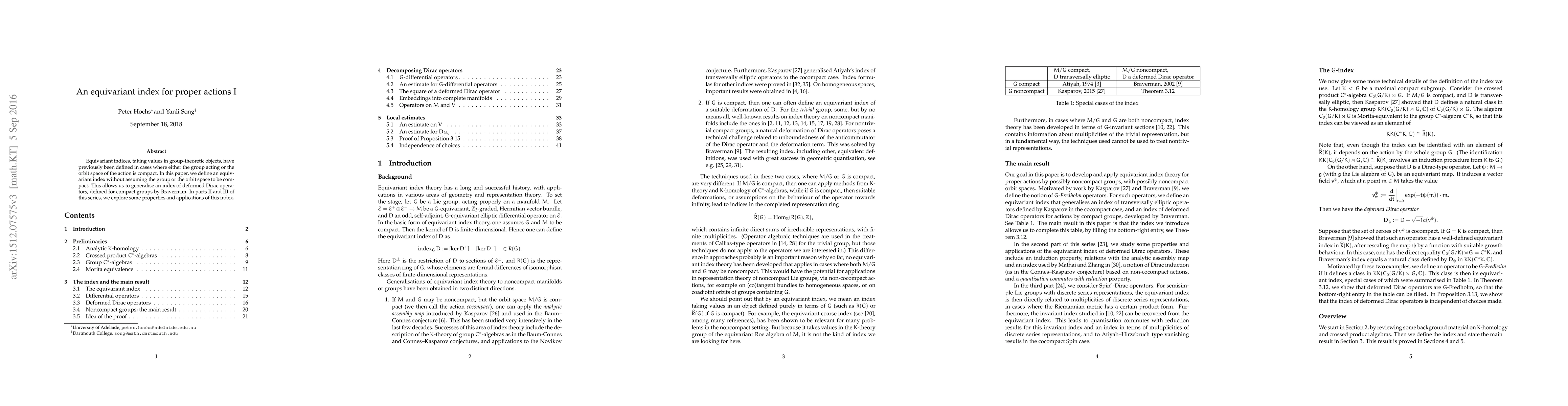 Equivariant indices have previously been defined in cases where either the group or the orbit space in question is compact. In this paper, we develop an equivariant index without assuming the group or the orbit space to be compact. This allows us to generalise an index of deformed Dirac operators, defined for compact groups by Braverman. In parts II and III of this series, we will explore some properties and applications of this index.