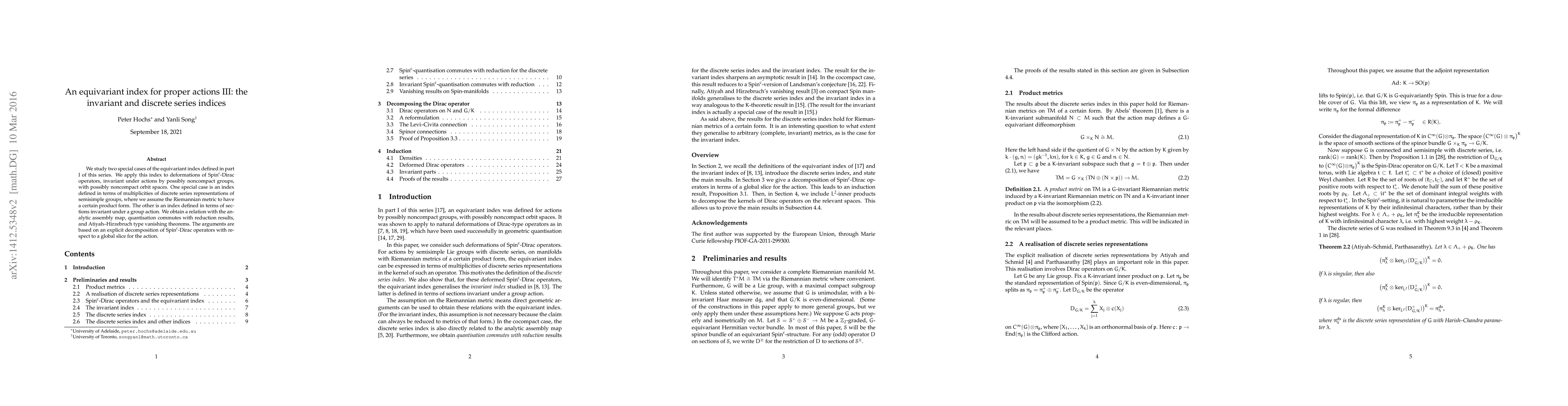 This paper explores two special cases of an equivariant index for proper actions, applying it to Spin^c-Dirac operators with certain group actions, and establishing relationships between the index and analytic assembly maps, quantisation, and vanishing theorems.