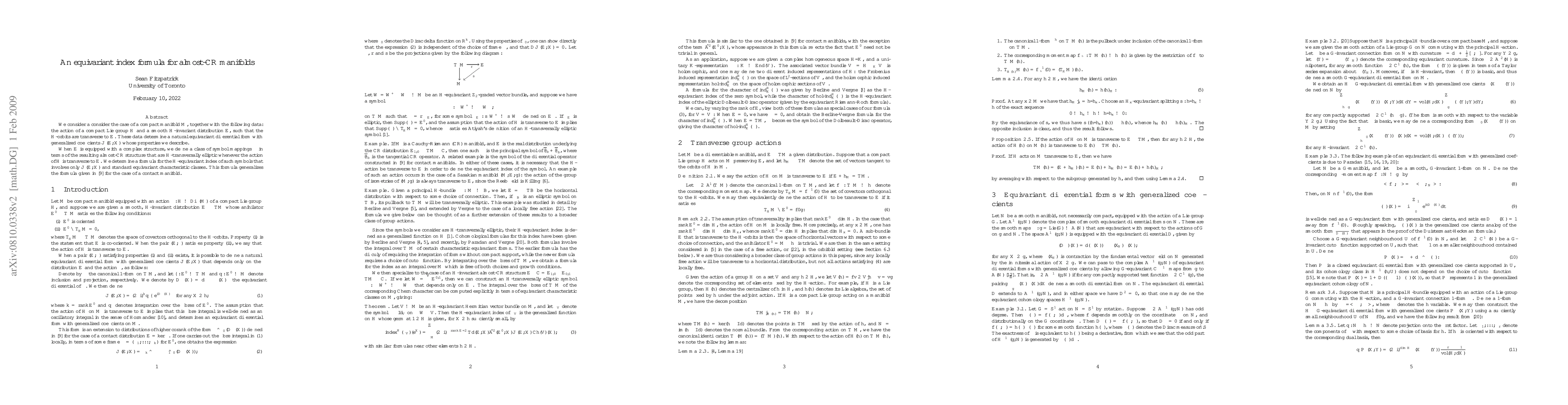 We consider a consider the case of a compact manifold M, together with the following data: the action of a compact Lie group H and a smooth H-invariant distribution E, such that the H-orbits are transverse to E. These data determine a natural equivariant differential form with generalized coefficients J(E,X) whose properties we describe. When E is equipped with a complex structure, we define a class of symbol mappings in terms of the resulting almost-CR structure that are H-transversally elliptic whenever the action of H is transverse to E. We determine a formula for the H-equivariant index of such symbols that involves only J(E,X) and standard equivariant characteristic classes. This formula generalizes the formula given in arXiv:0712.2431 for the case of a contact manifold.