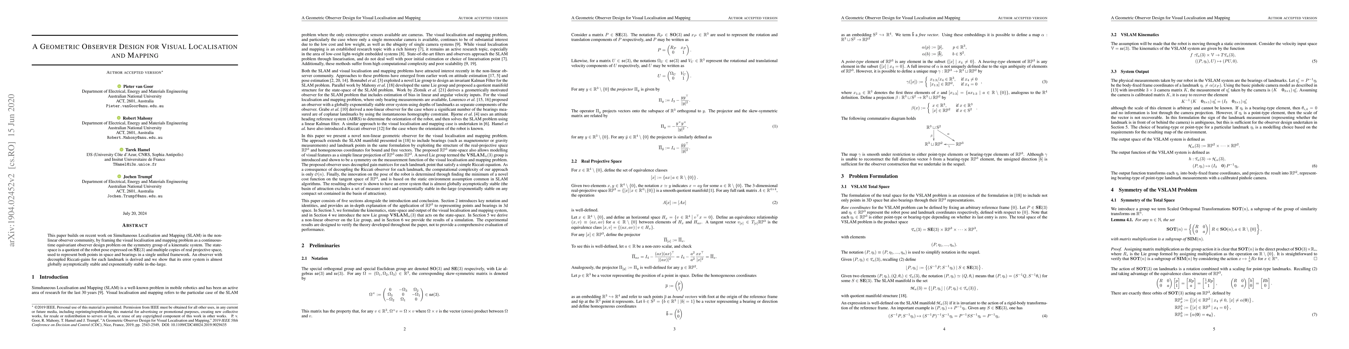 This paper builds on recent work on Simultaneous Localisation and Mapping (SLAM) in the non-linear observer community, by framing the visual localisation and mapping problem as a continuous-time equivariant observer design problem on the symmetry group of a kinematic system. The state-space is a quotient of the robot pose expressed on SE(3) and multiple copies of real projective space, used to represent both points in space and bearings in a single unified framework. An observer with decoupled Riccati-gains for each landmark is derived and we show that its error system is almost globally asymptotically stable and exponentially stable in-the-large.