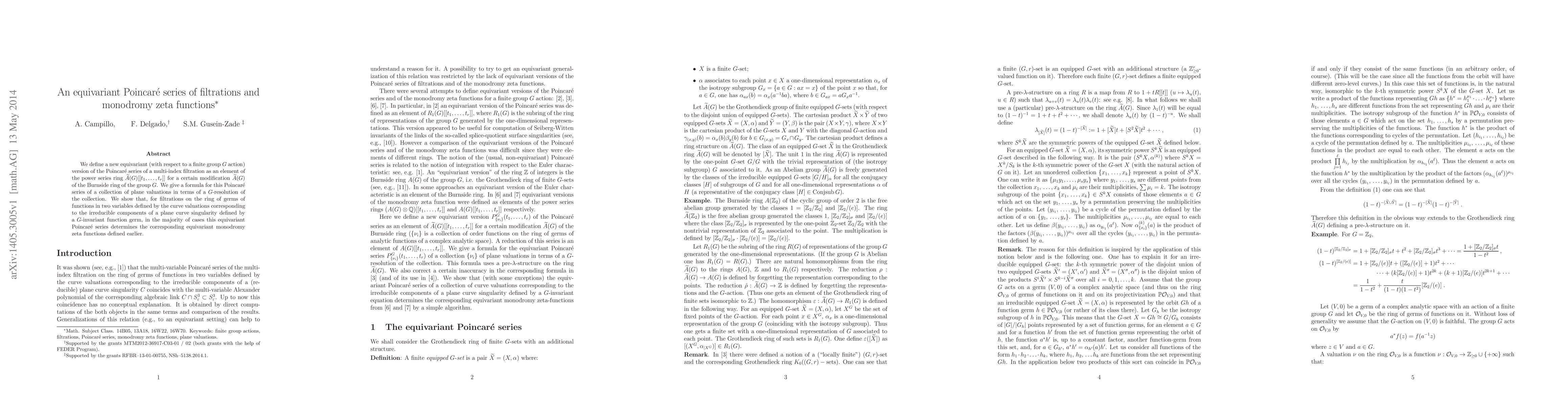 This paper introduces an equivariant version of the Poincaré series for multi-index filtrations, expressed in terms of the Burnside ring's modification ${\widetilde{A}}(G)$. It connects this series to $G$-resolutions of plane valuations and demonstrates its ability to determine equivariant monodromy zeta functions for plane curve singularities.